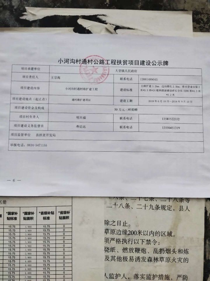 小河沟村通村公路工程扶贫项目建设公示牌 |