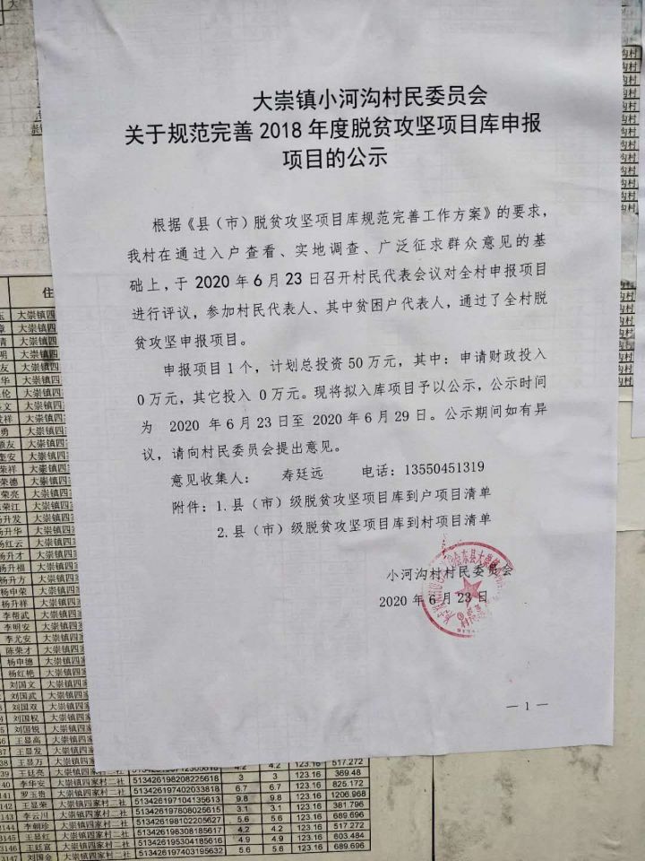 现将经2020年 6月 23日 小河沟村村民代表大会讨论通过的拟实施扶贫项目进行公示,公示时间为 2020 年 6月23日至2020年6月23日,如对以下公示内容有异议,请于公示期内向村委会反映。