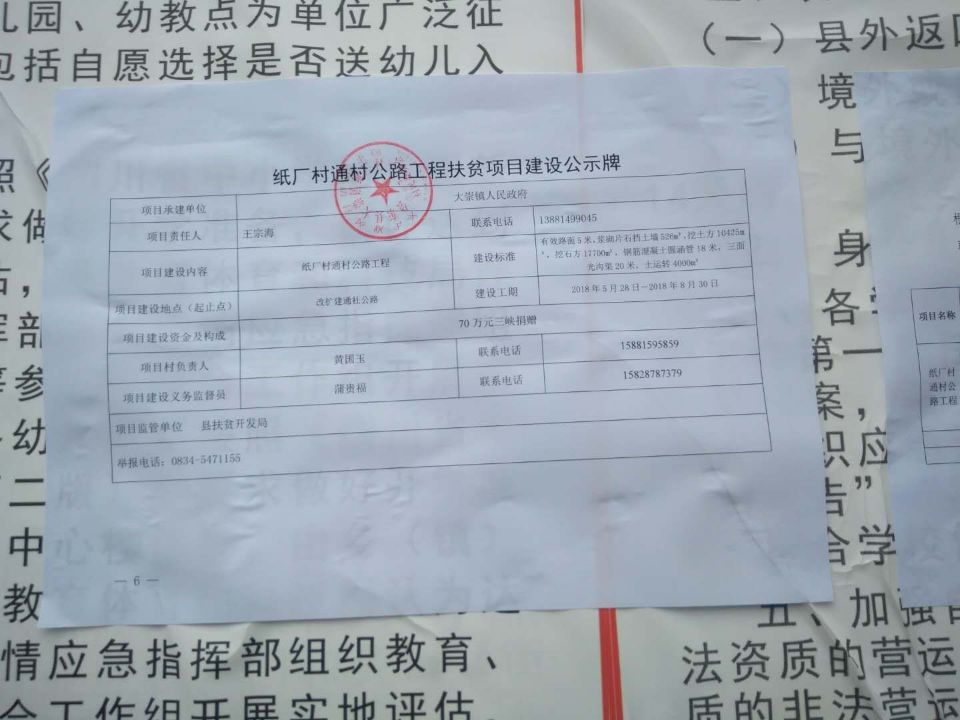 纸厂村通村公路工程扶贫项目建设公示牌 |
