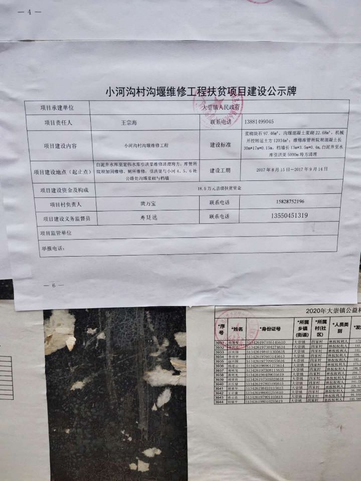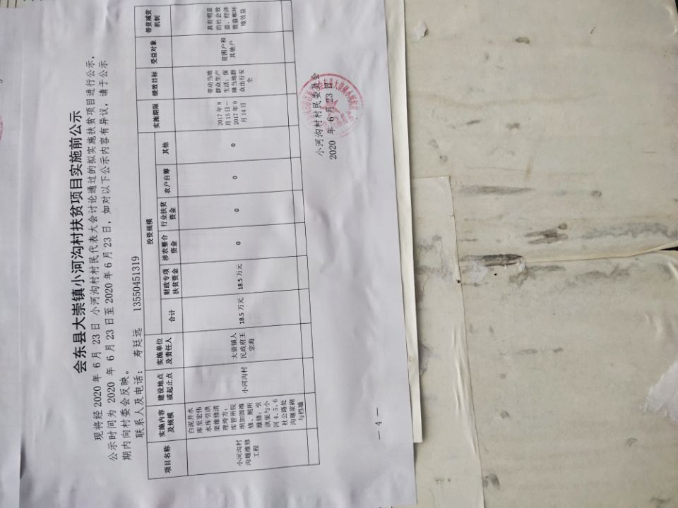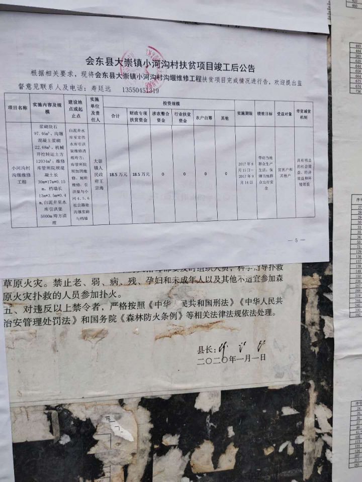 根据相关要求,现将会东县大崇镇小河沟村沟堰维修工程扶贫项目完成情况进行告,欢迎提出监督意见联系人及电话:寿廷远 13550451319