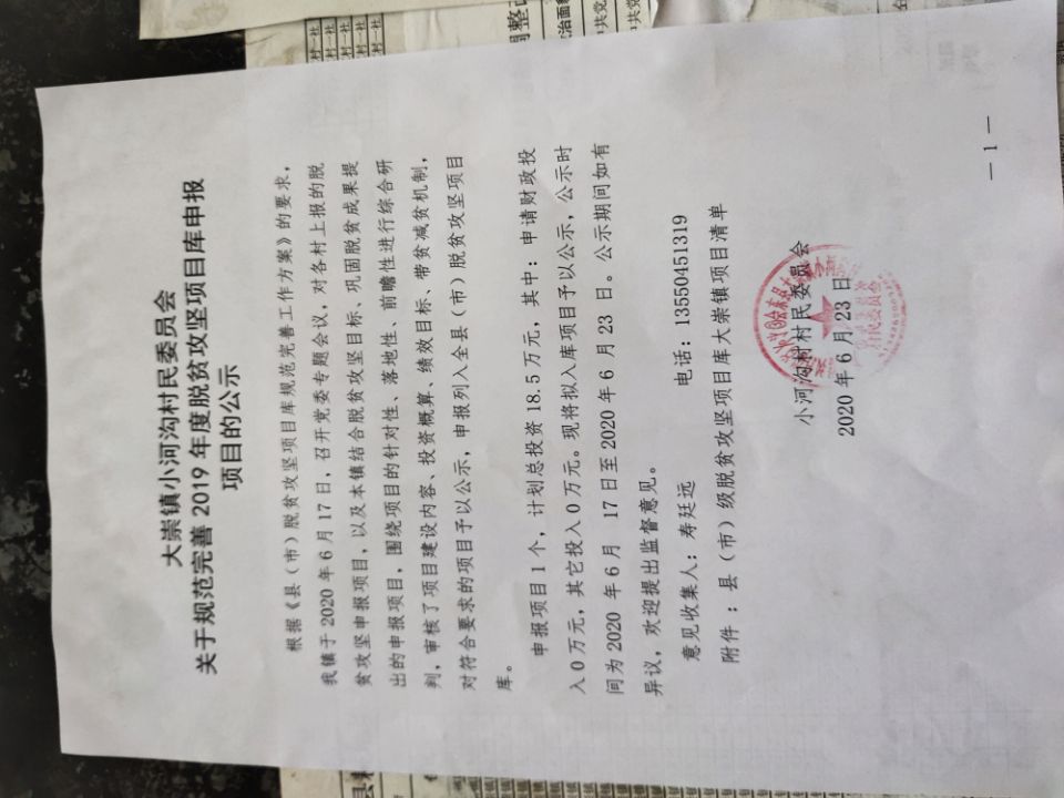 现将经2020年 6月 23日 小河沟村村民代表大会讨论通过的拟实施扶贫项目进行公示,公示时间为 2020 年 6月23日至2020年6月23日,如对以下公示内容有异议,请于公示期内向村委会反映。