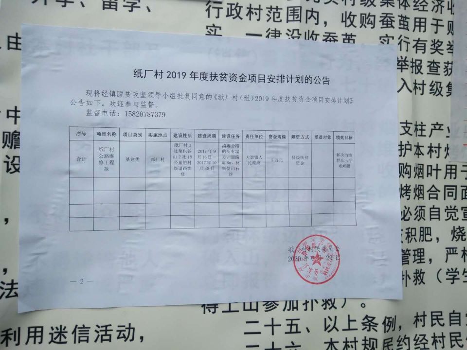 纸厂村关于2019年度扶贫资金项目计划完成情况的公告