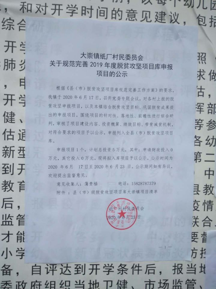 现将经2020年 6月 23日 纸厂村村民代表大会讨论通过的拟实施扶贫项目进行公示,公示时间为 2020 年 6月23日至2020年6月23日,如对以下公示内容有异议,请于公示期内向村委会反映。