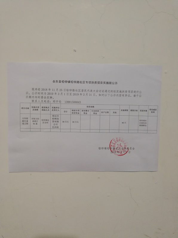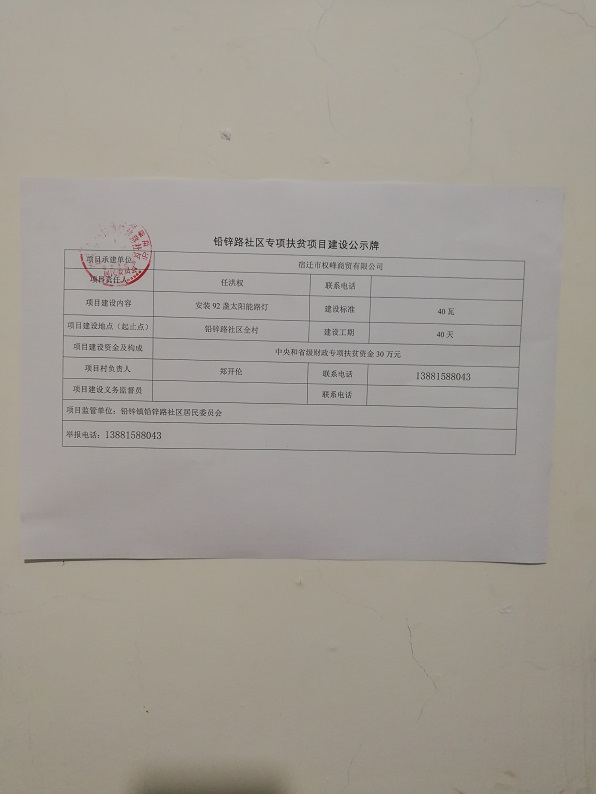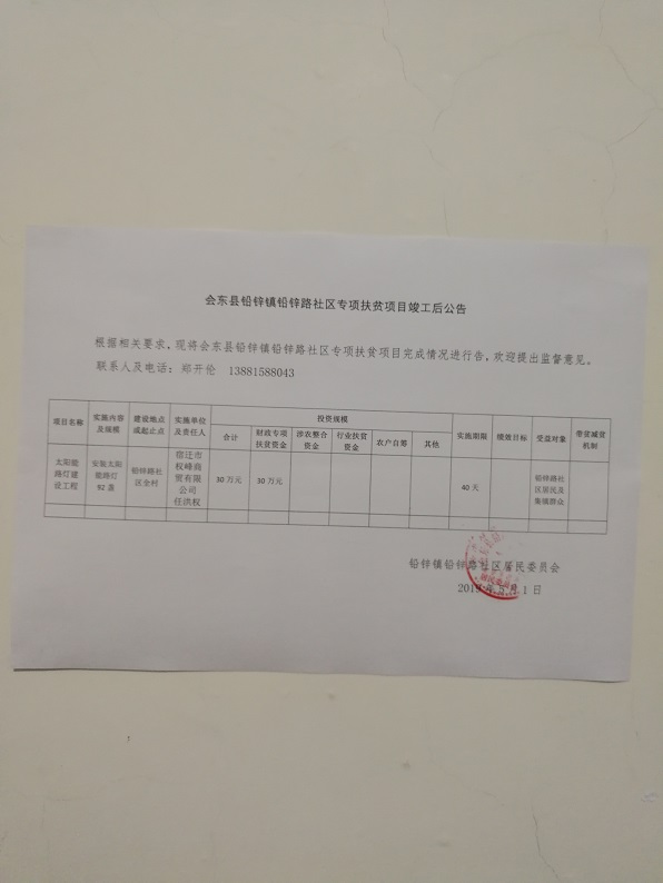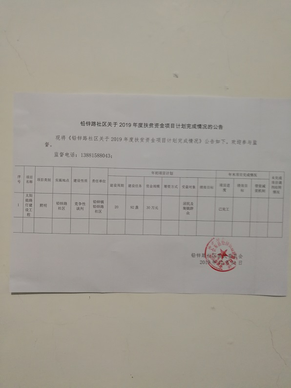 铅锌路社区2019年度专项扶贫资金项目公告公示 (太阳能路灯建设工程)