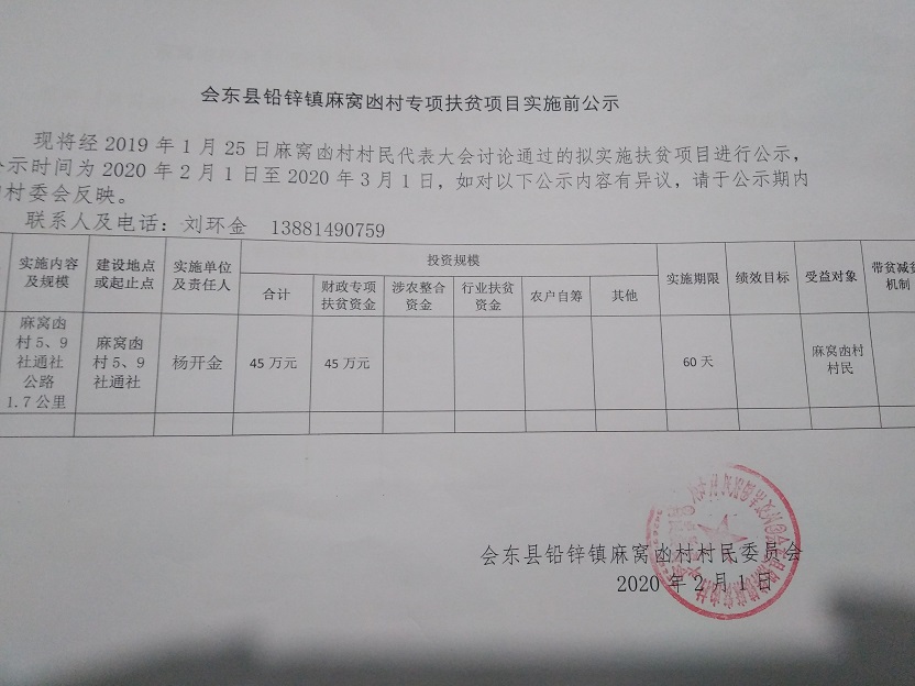 麻窝凼村2019年度专项扶贫资金项目公告公示(5、9社通社路硬化)