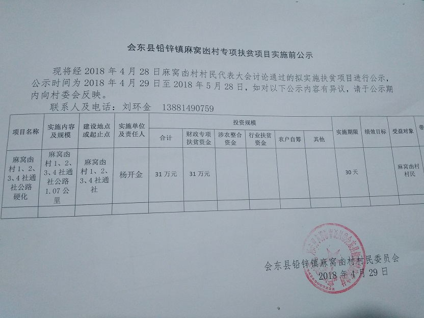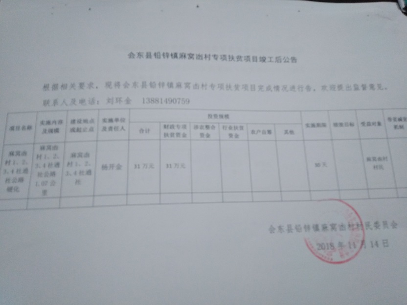 麻窝凼村2019年度专项扶贫资金项目公告公示(1、2、3、4社通社路硬化)