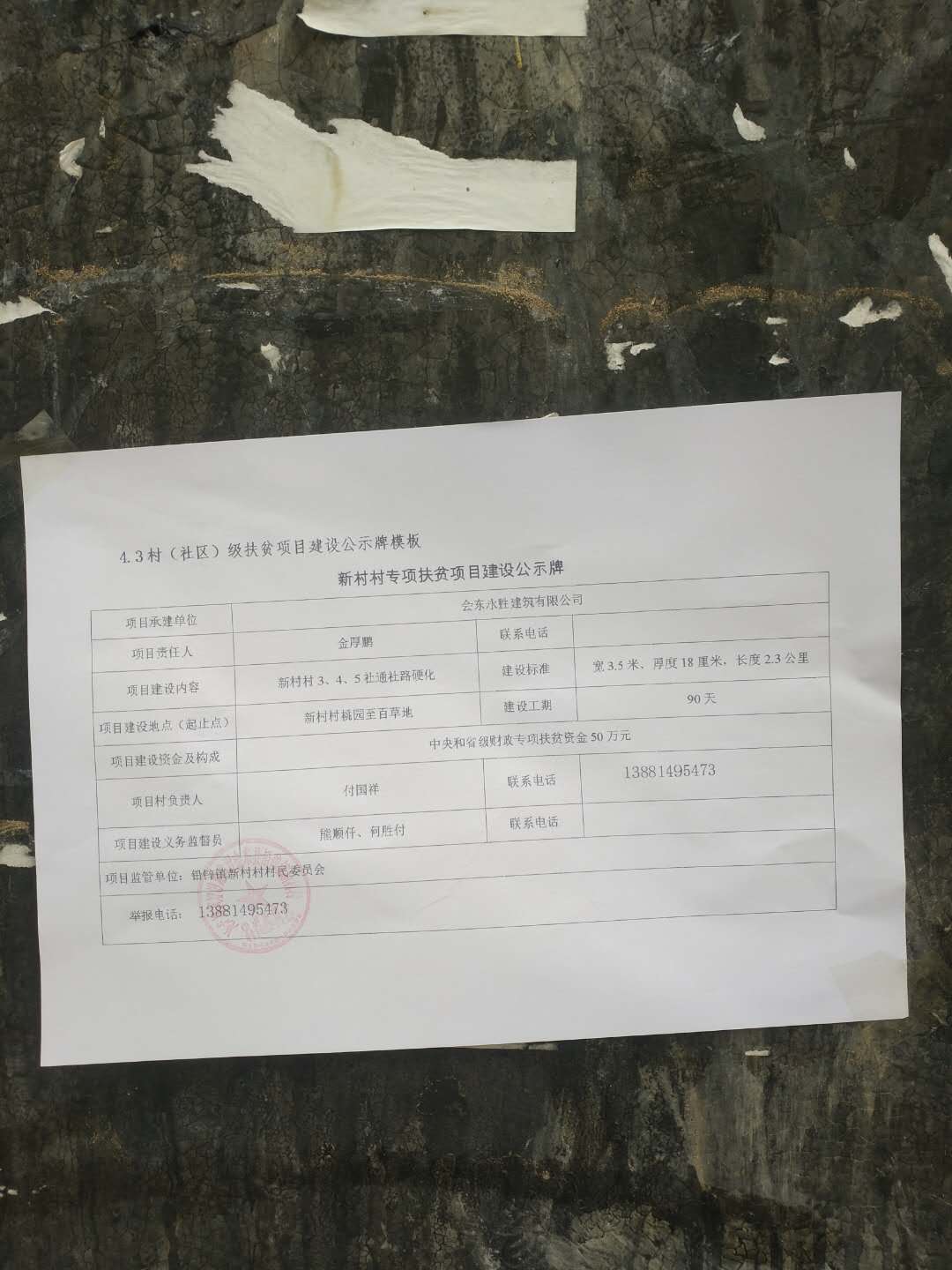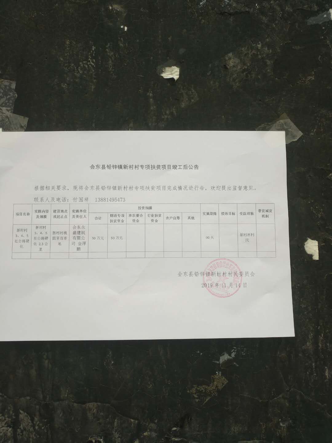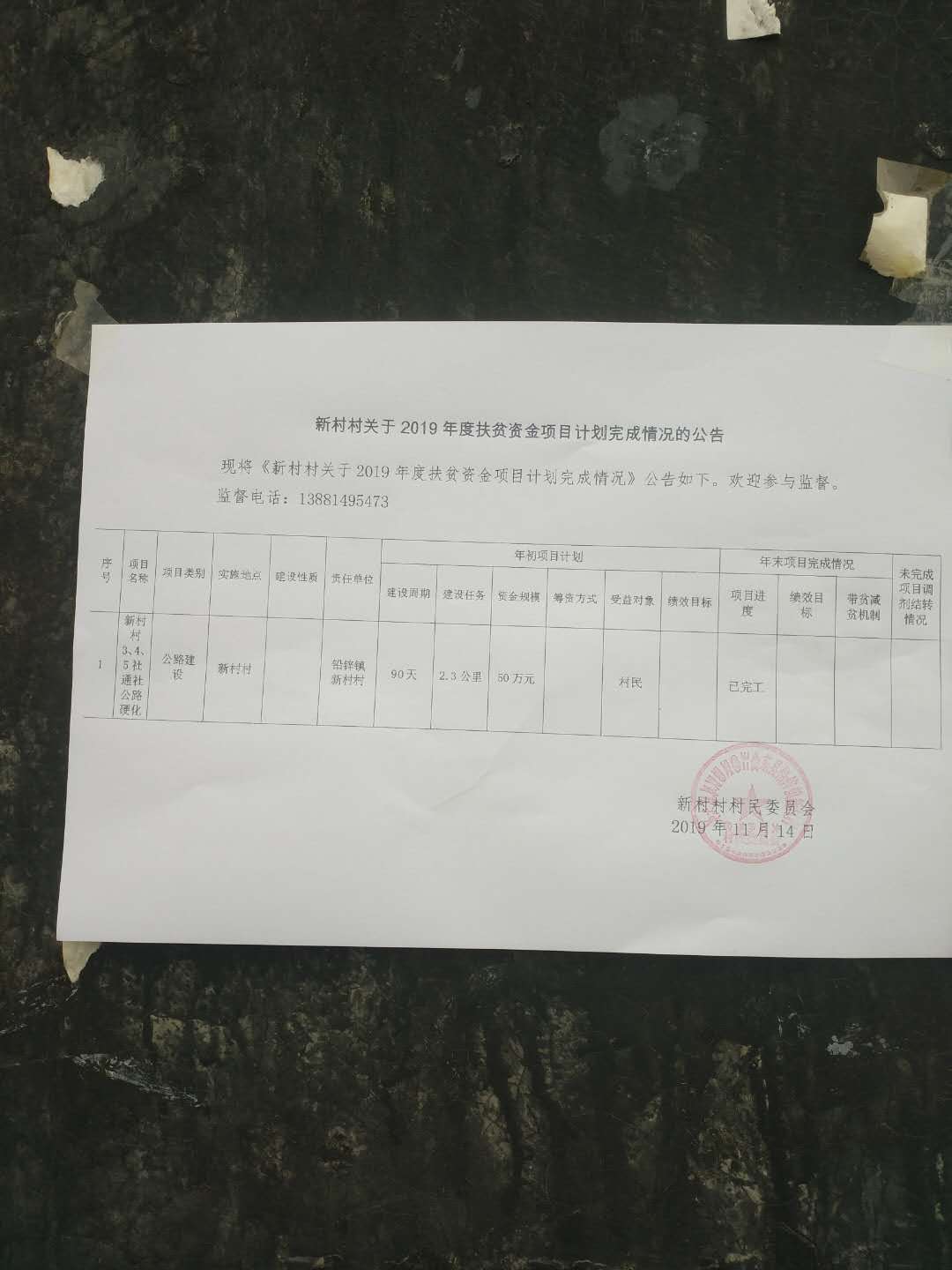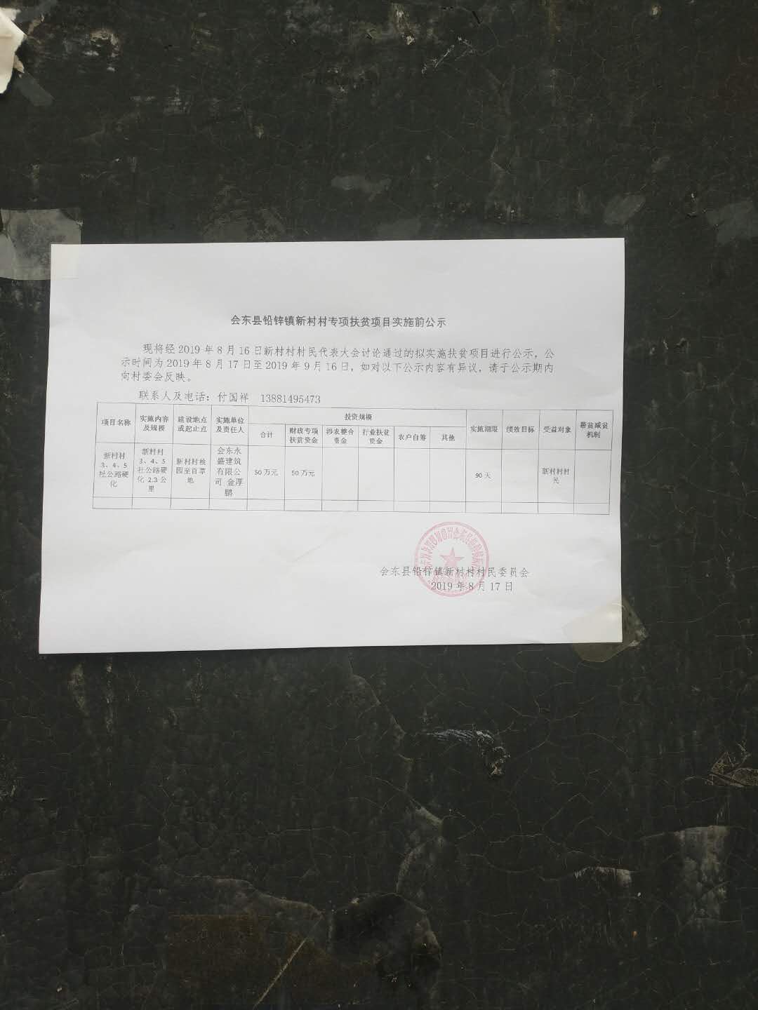 新村村2019年专项扶贫资金项目公告公示(3、4、5社通社路硬化)