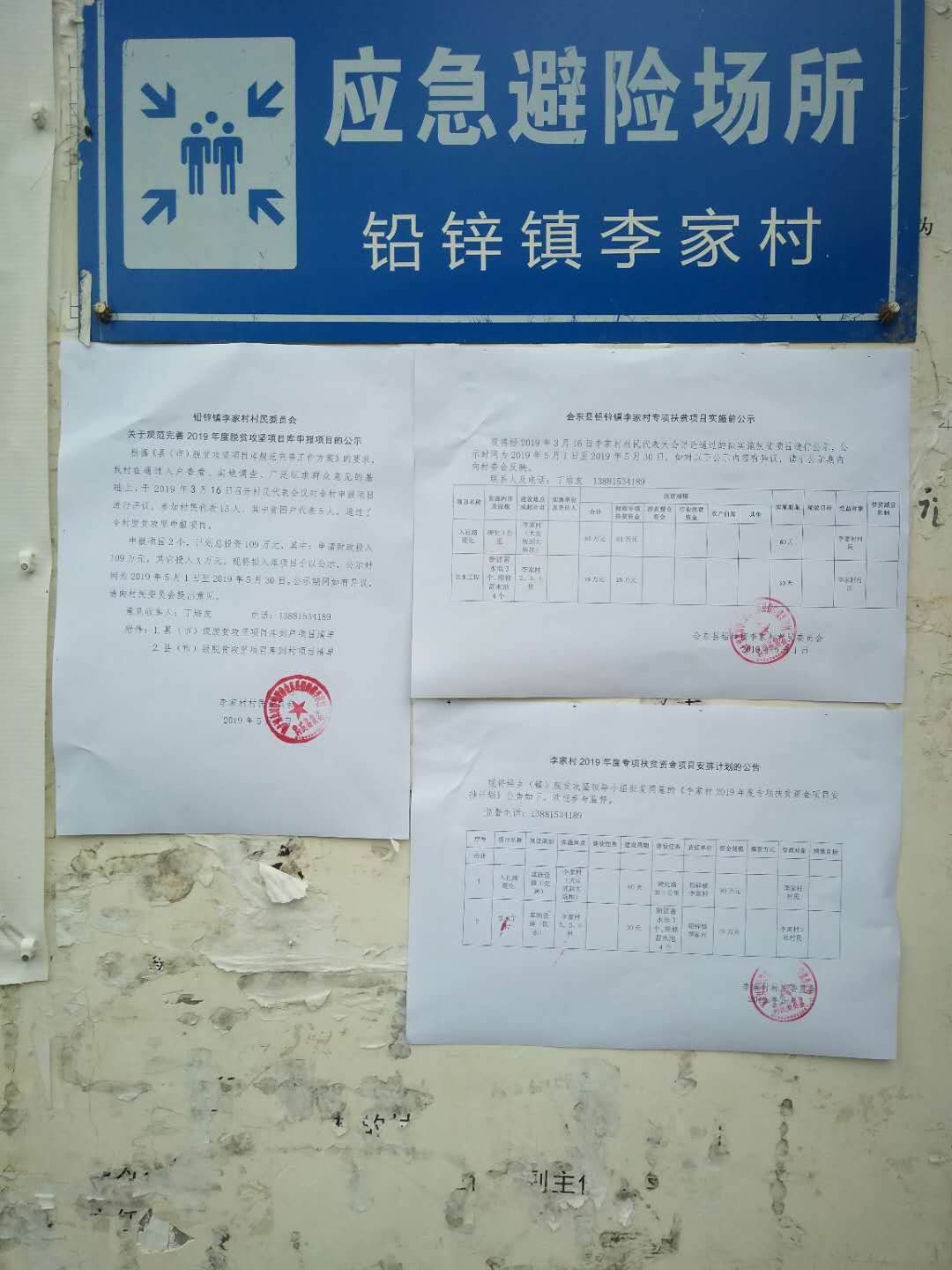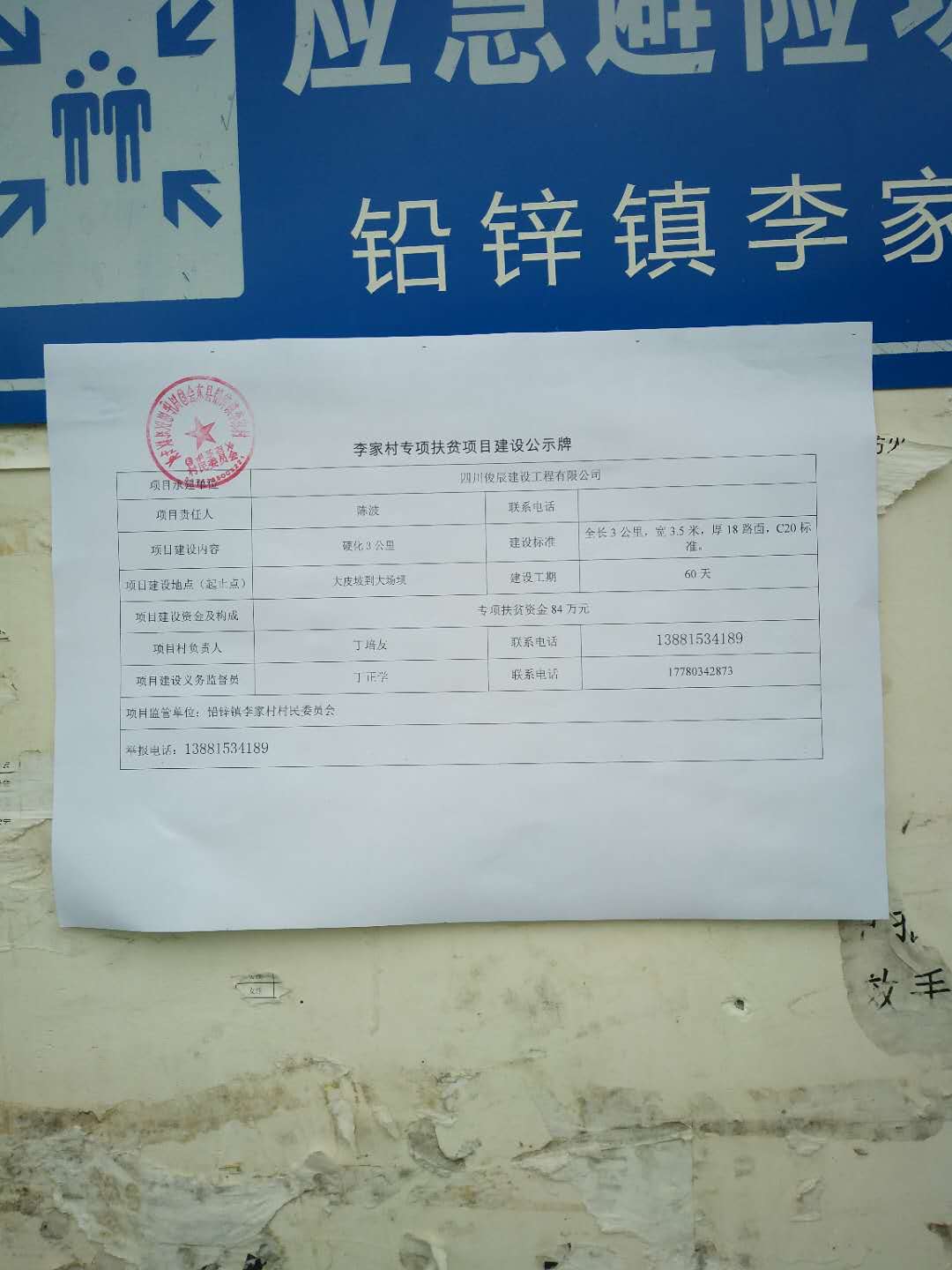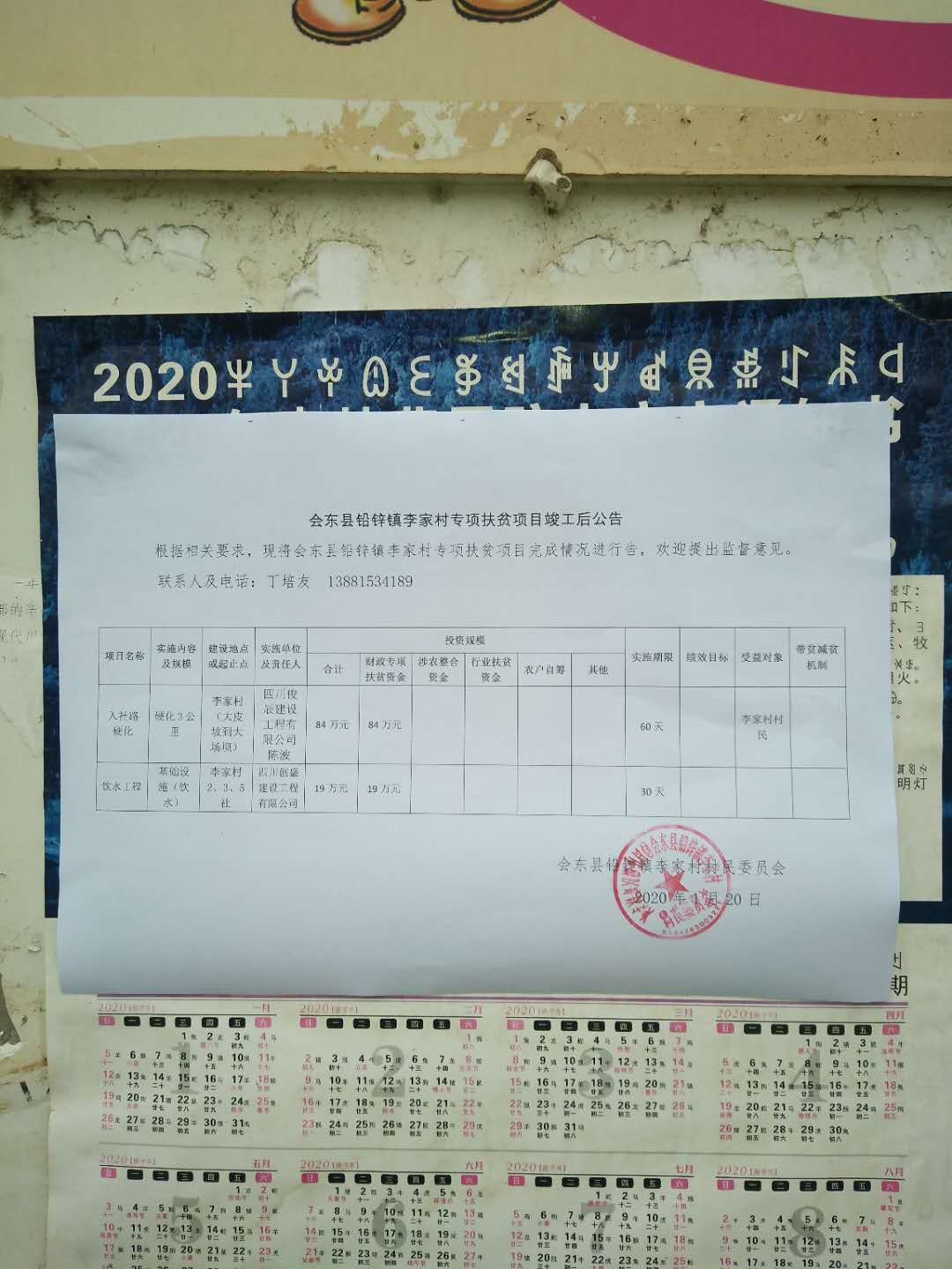 李家村2019年度专项扶贫资金项目公告公示(入社路硬化3公里、饮水工程)