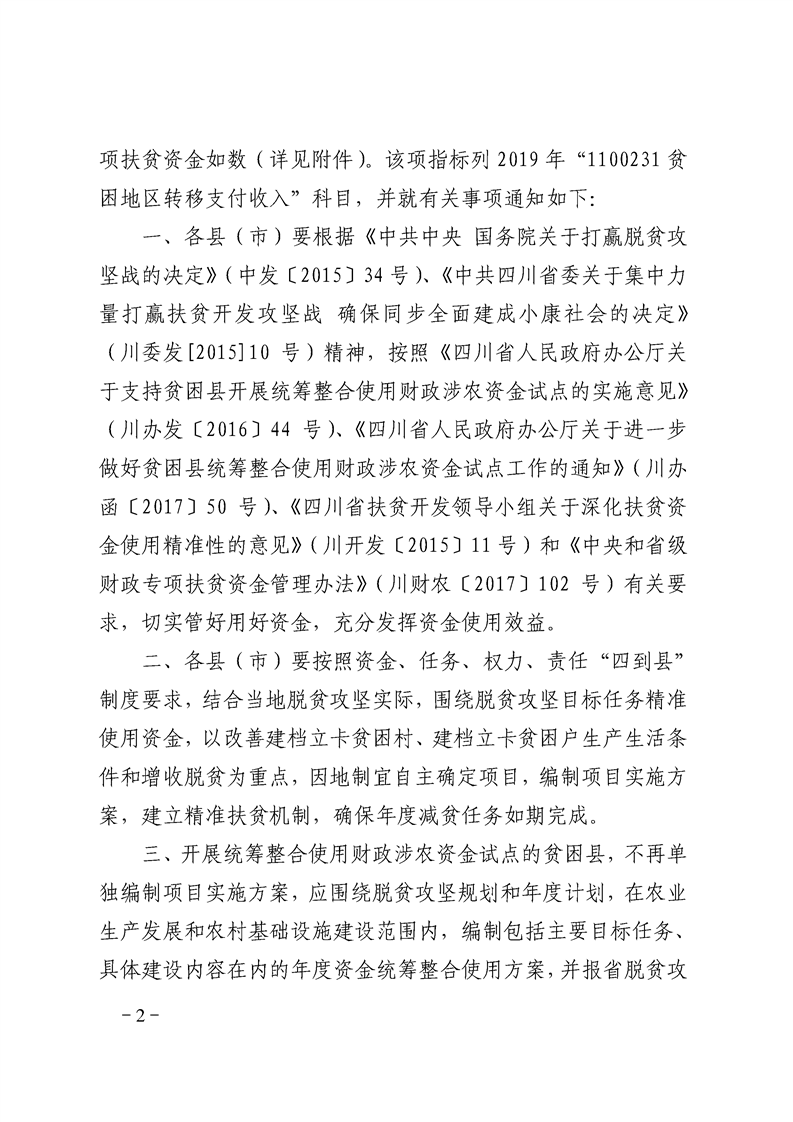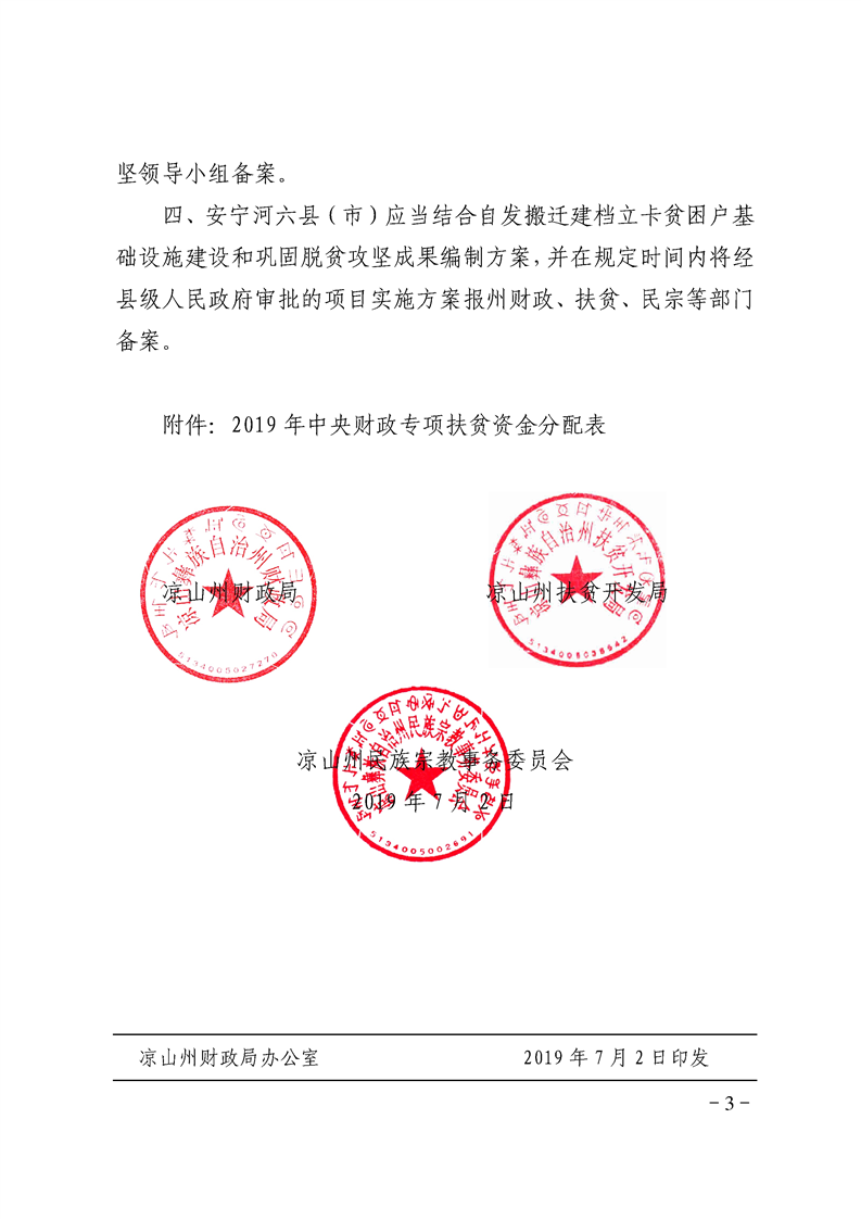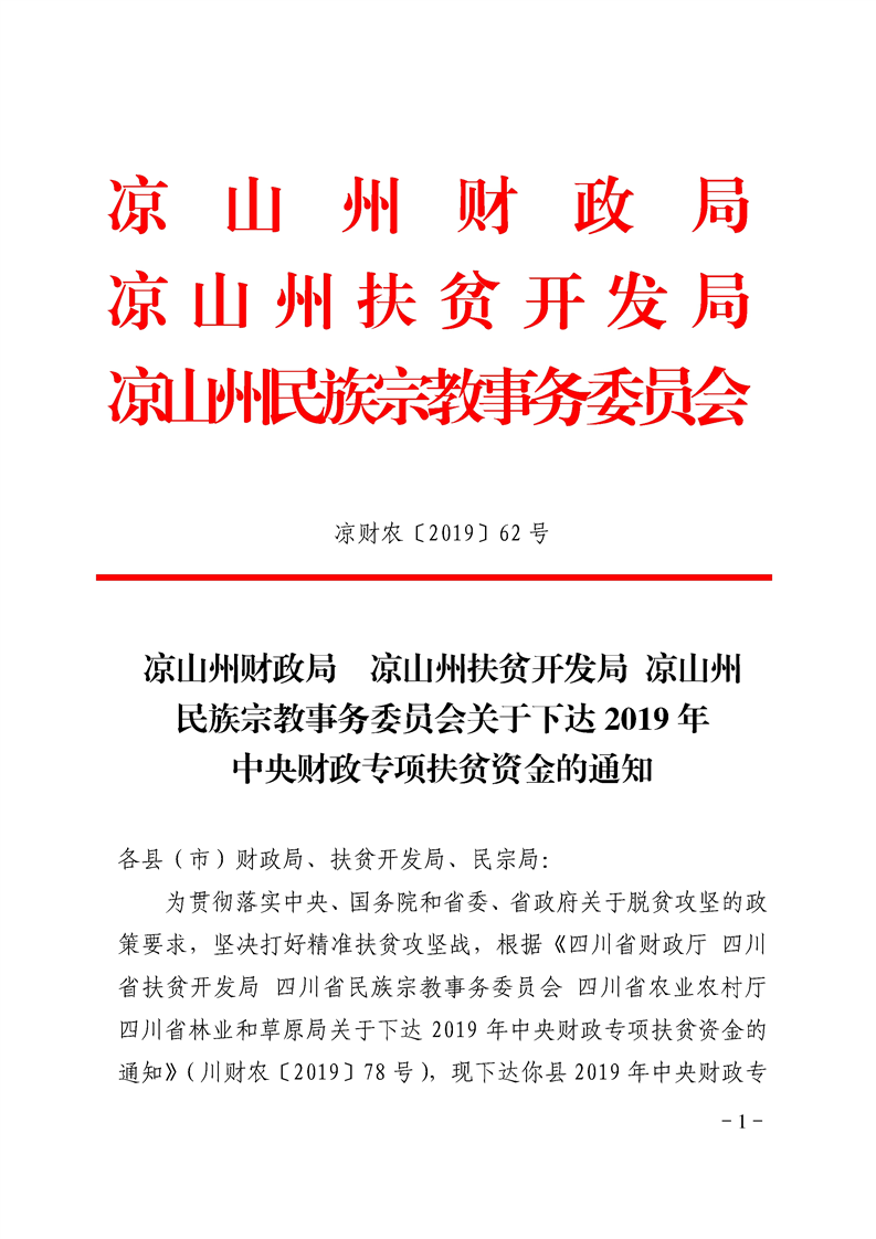 凉山州财政局 凉山州扶贫开发局 凉山州民族宗教事务委员会关于下达2019年中央财政专项扶贫资金的通知