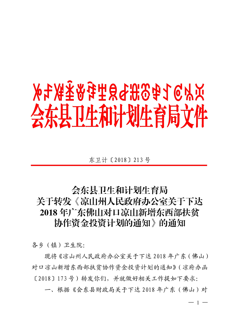 东卫计〔2018〕213号 会东县卫计局 关于转发《凉山州人民政府办公室关于下达2018年广东佛山对口凉山新增东西部扶贫协作资金投资计划的通知》的通知