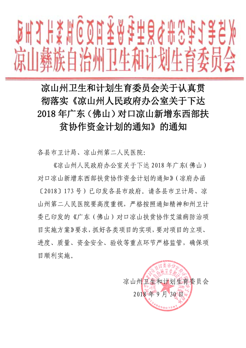 关于贯彻落实《凉山州人民政府办公室关于下达2018年广东(佛山)对口凉山新增东西部扶贫协作资金计划的通知》的通知