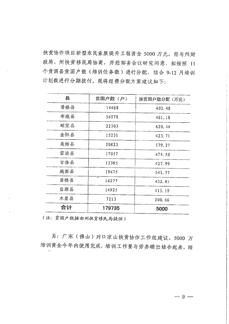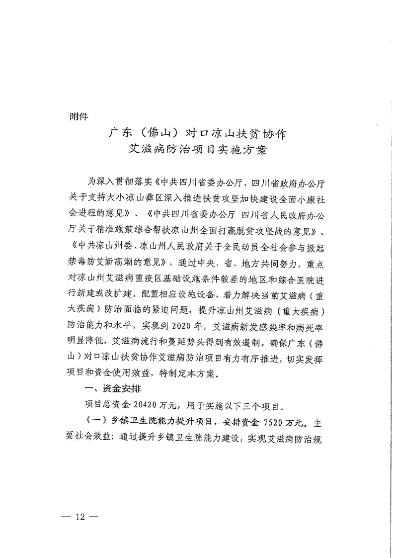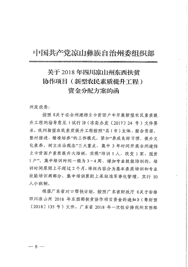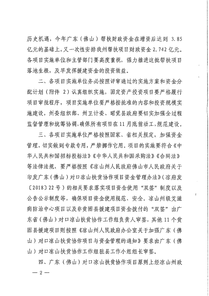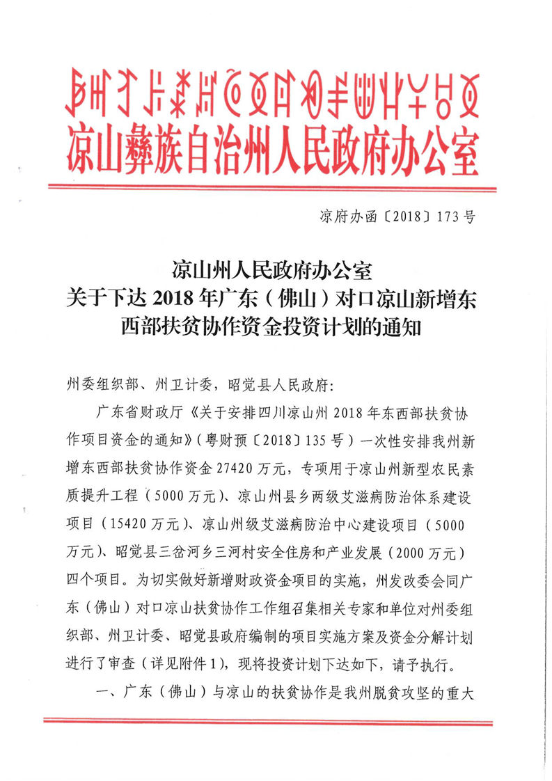 关于下达2018年广东(佛山)对口凉山扶贫协作新增东西部扶贫协作投资计划的通知(2.742亿元,173号文)