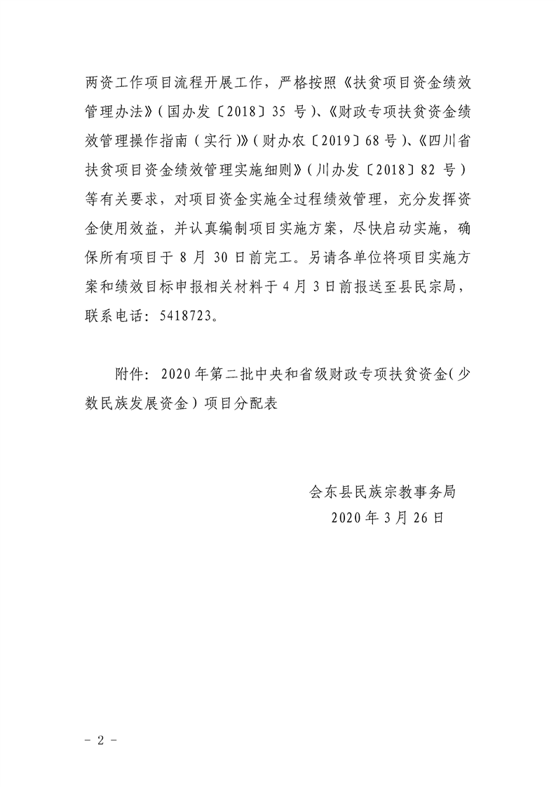 会东县民族宗教事务局 关于下达2020年第二批中央和省级财政专项扶贫资金(少数民族发展资金)的通知