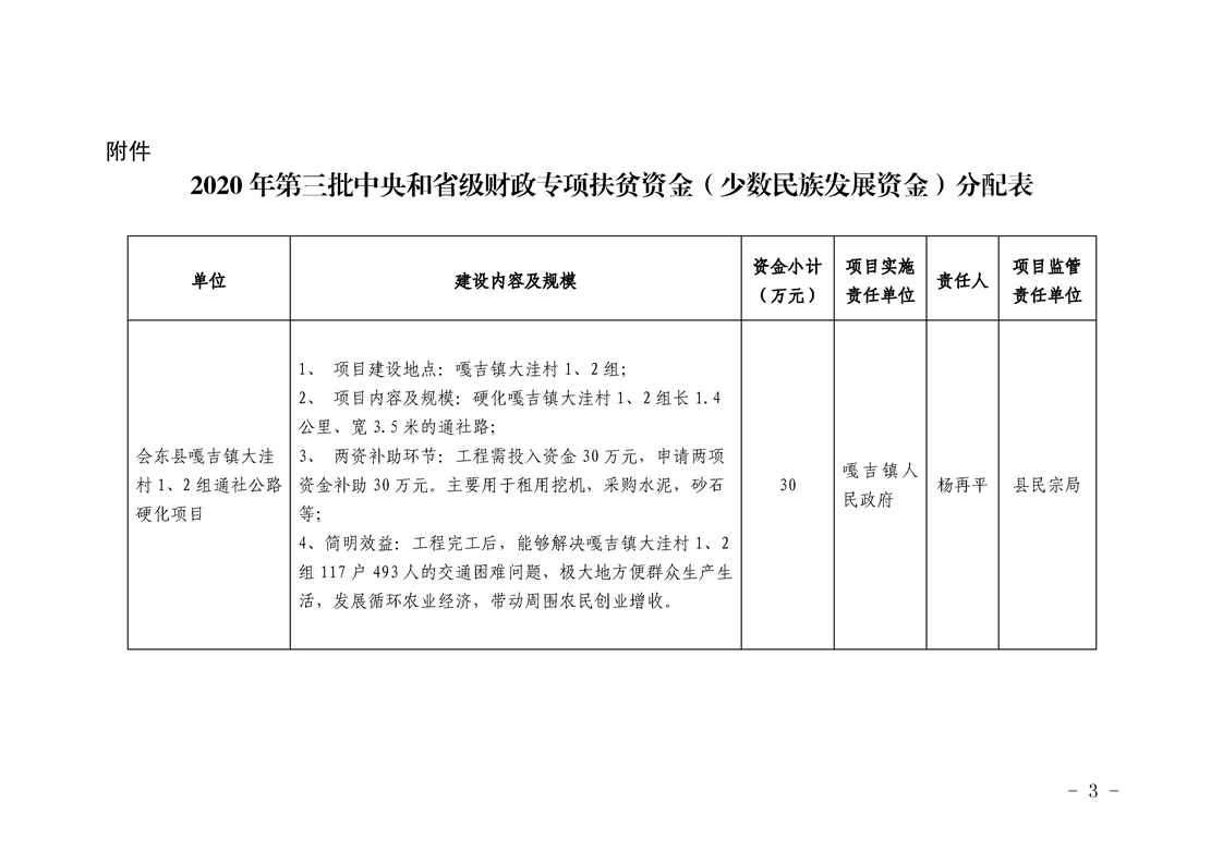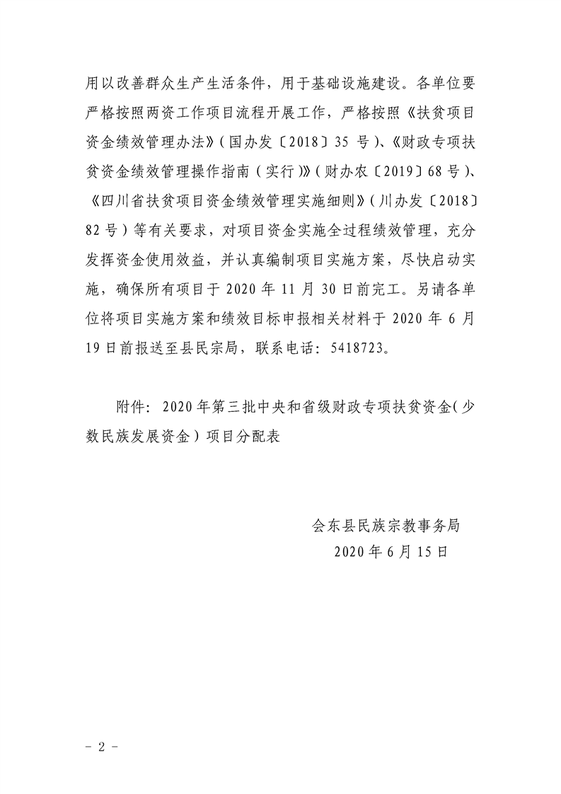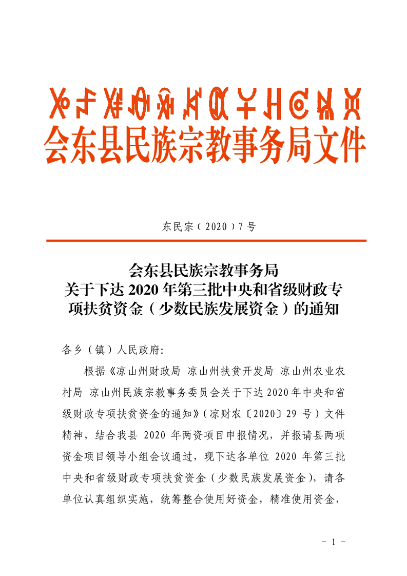 会东县民族宗教事务局 关于下达2020年第三批中央和省级财政专项扶贫资金(少数民族发展资金)的通知