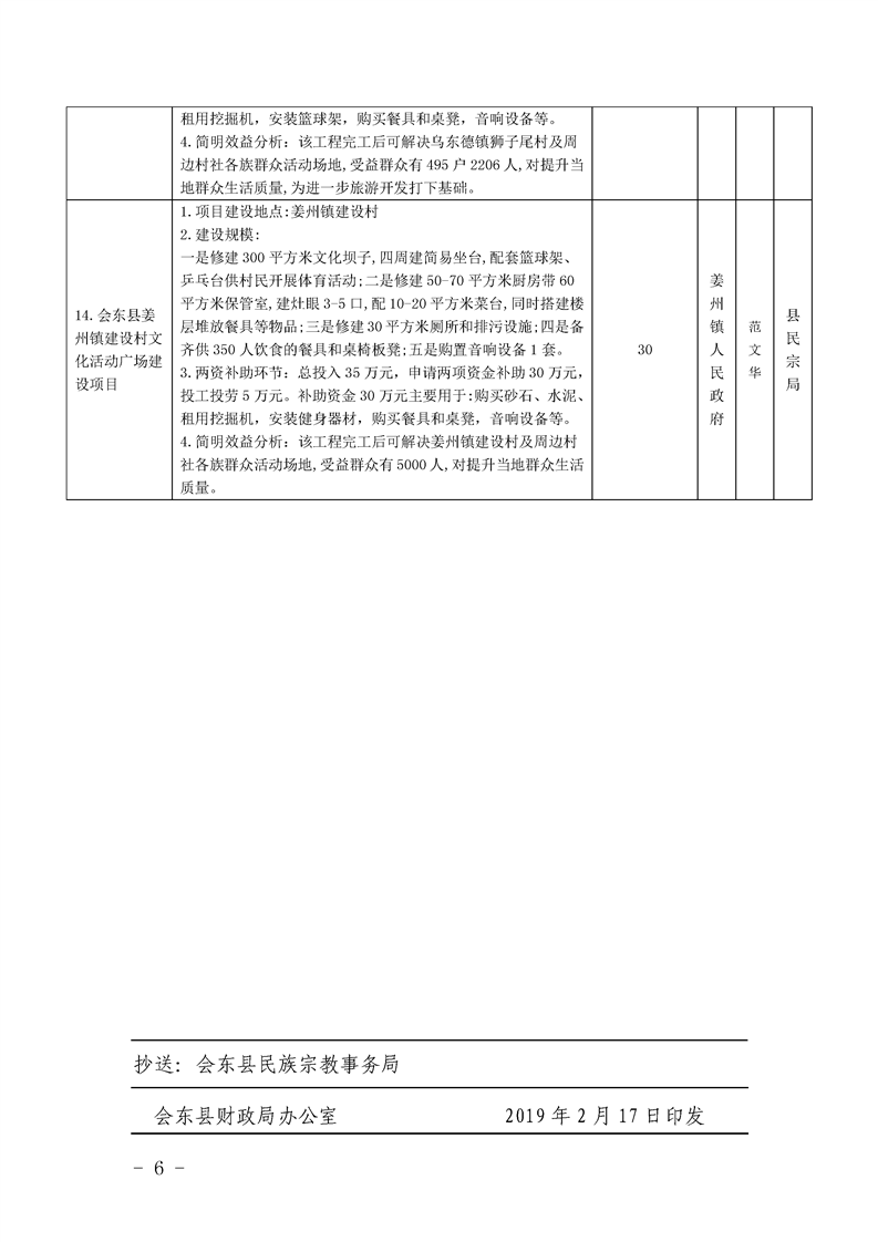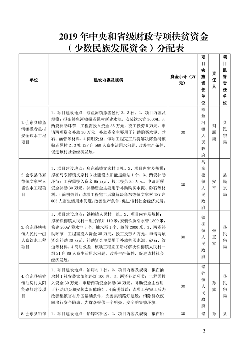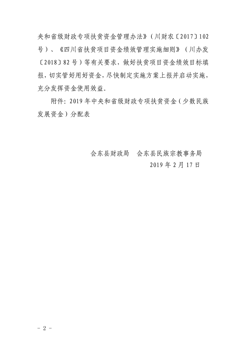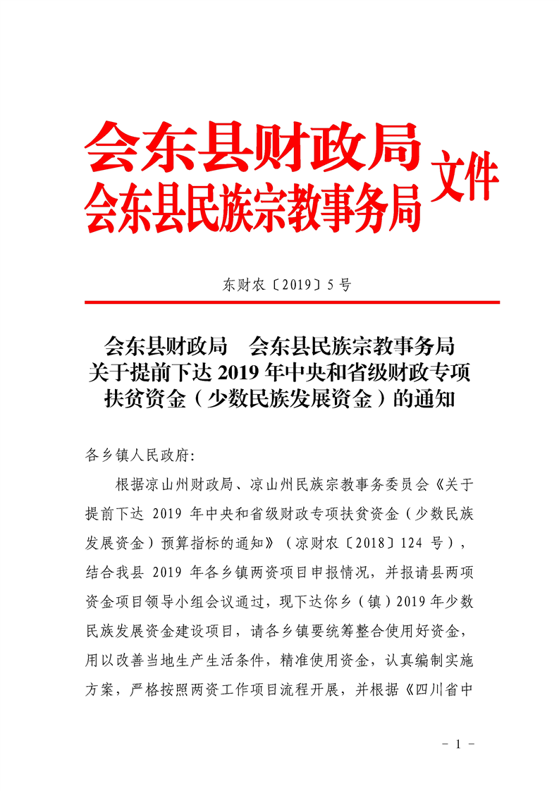 会东县财政局 会东县民族宗教事务局 关于提前下达2019年中央和省级财政专项扶贫资金(少数民族发展资金)的通知