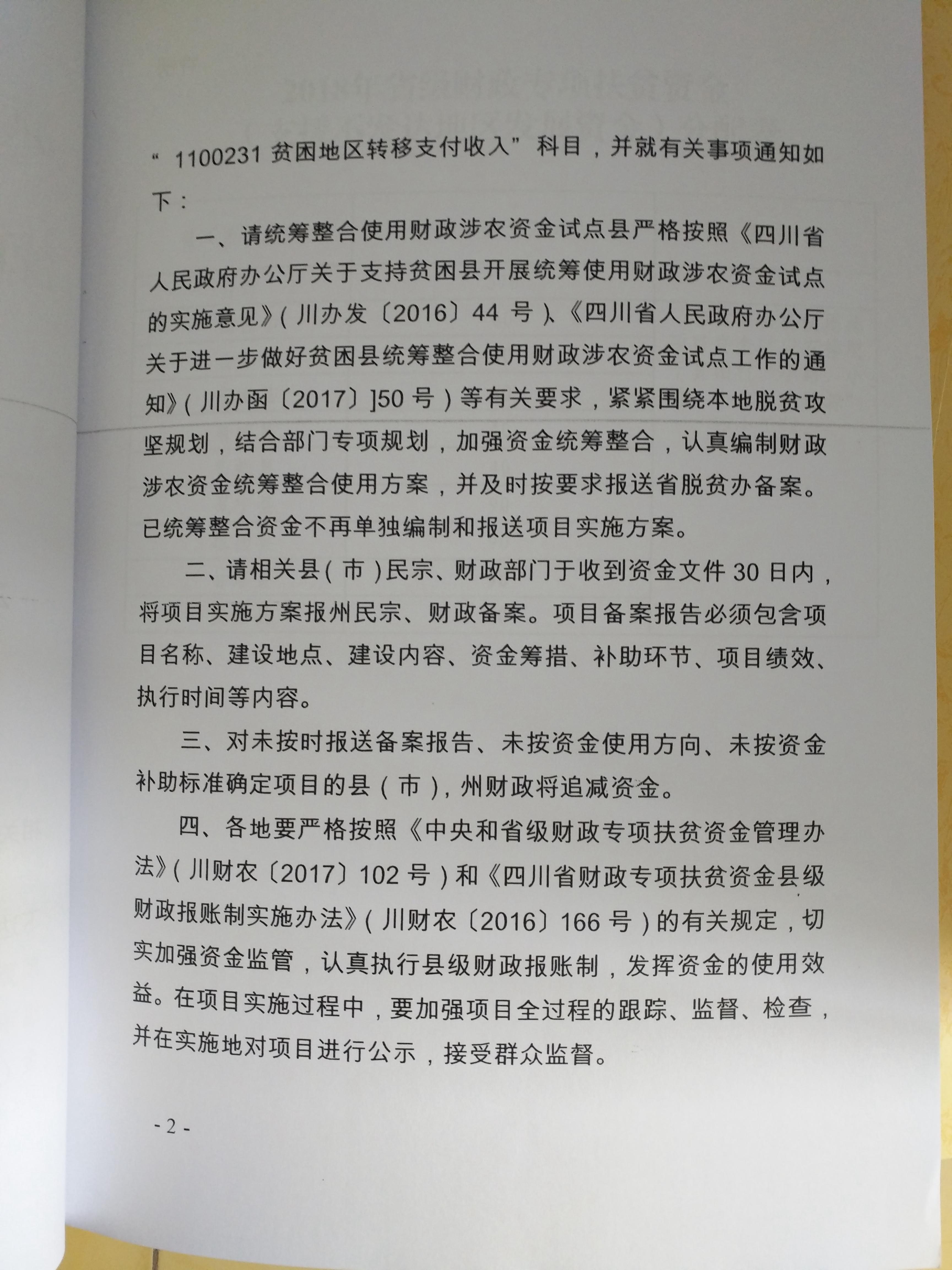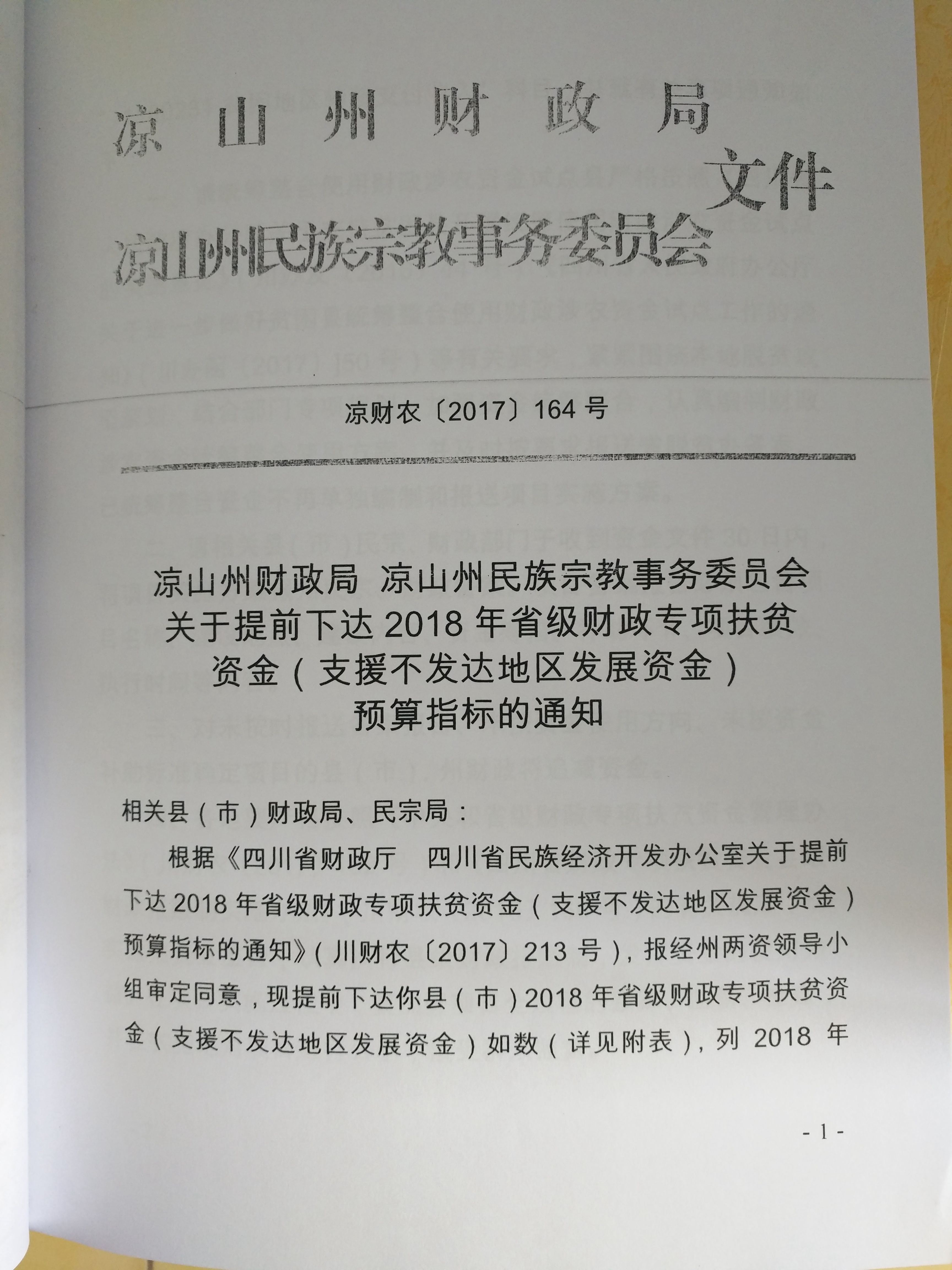 凉山州财政局 凉山州民族宗教事务委员会关于提前下达2018年省级财政专项扶贫资金(支援不发达地区发展资金)预算指标的通知