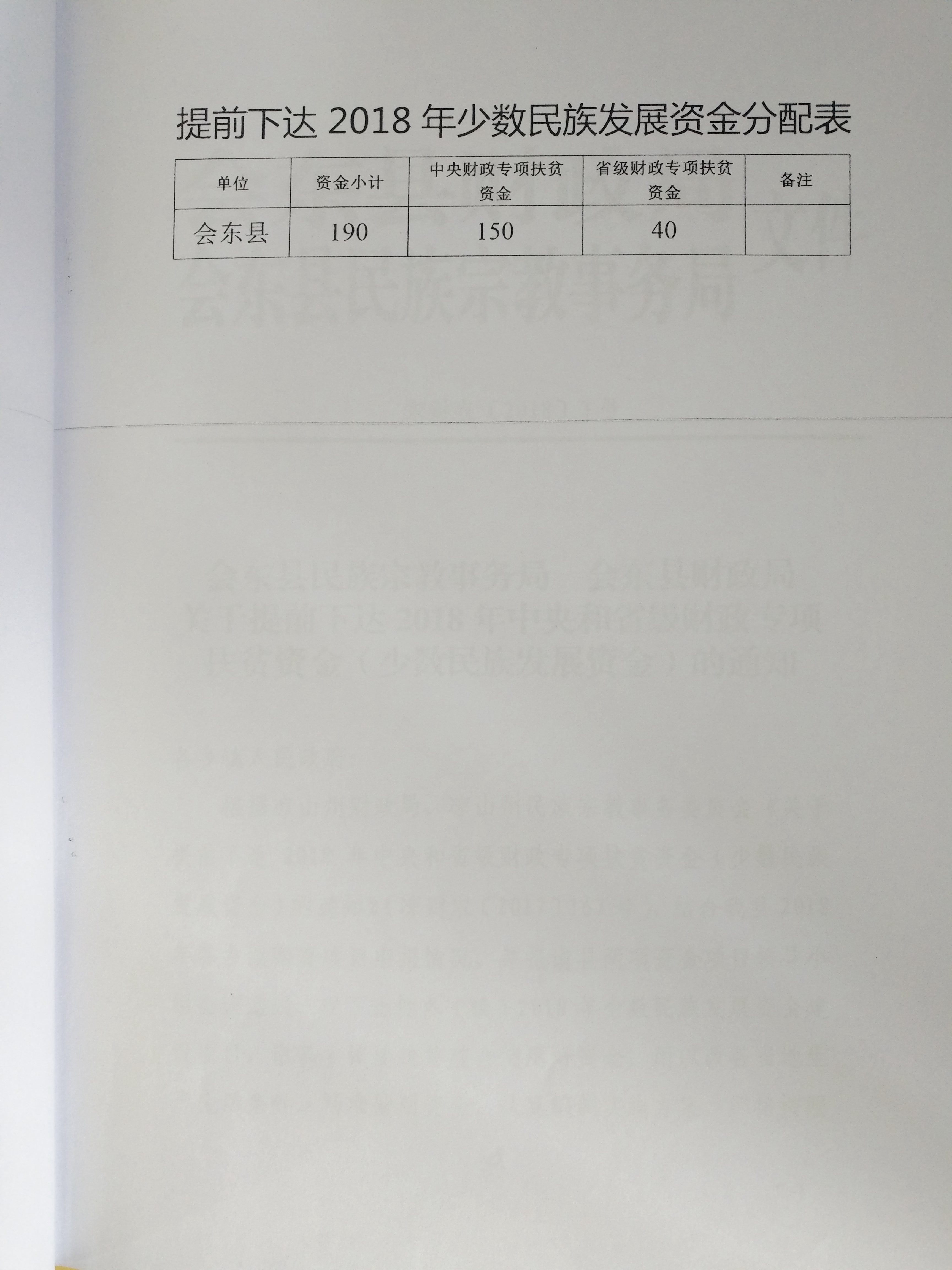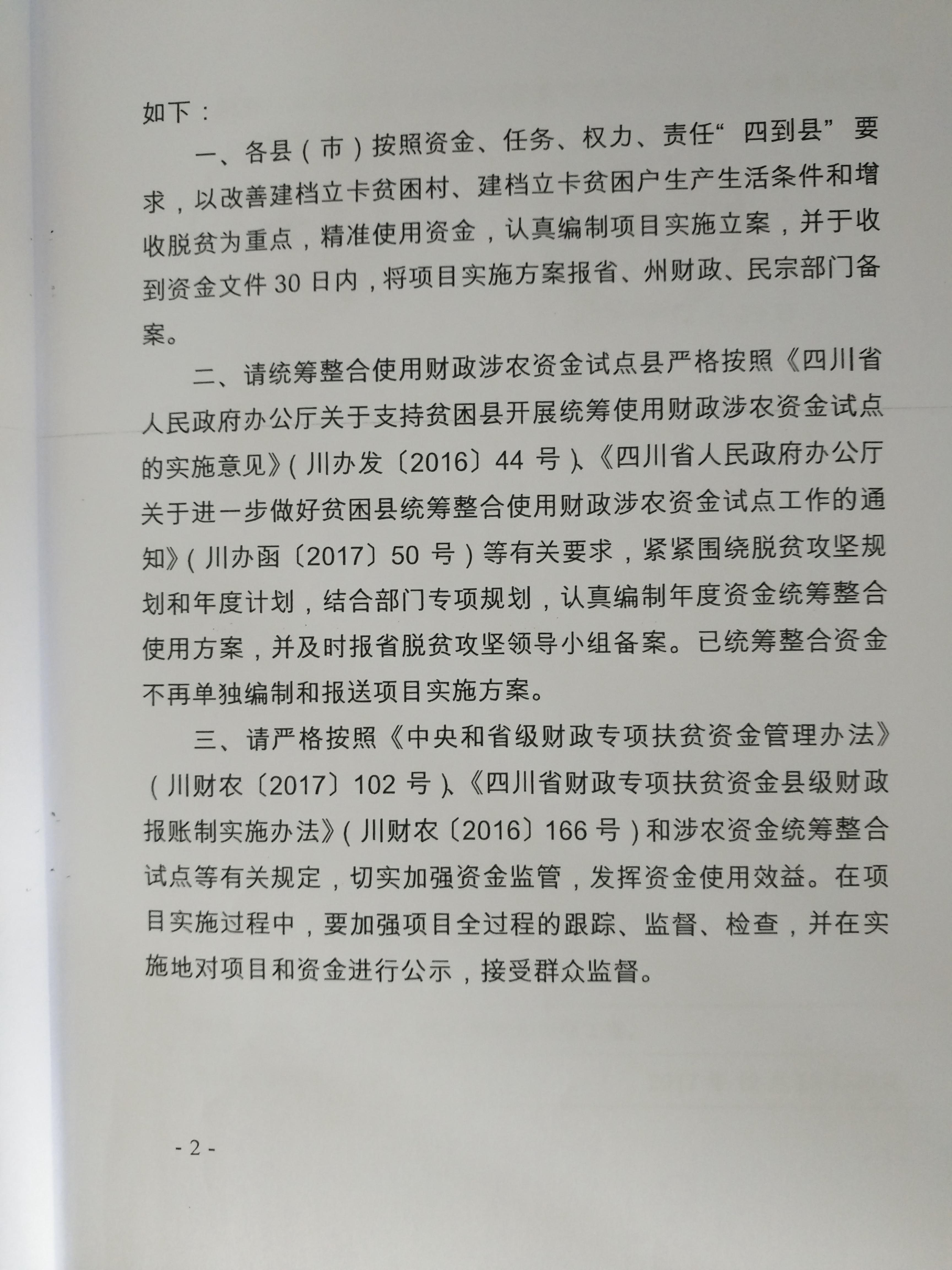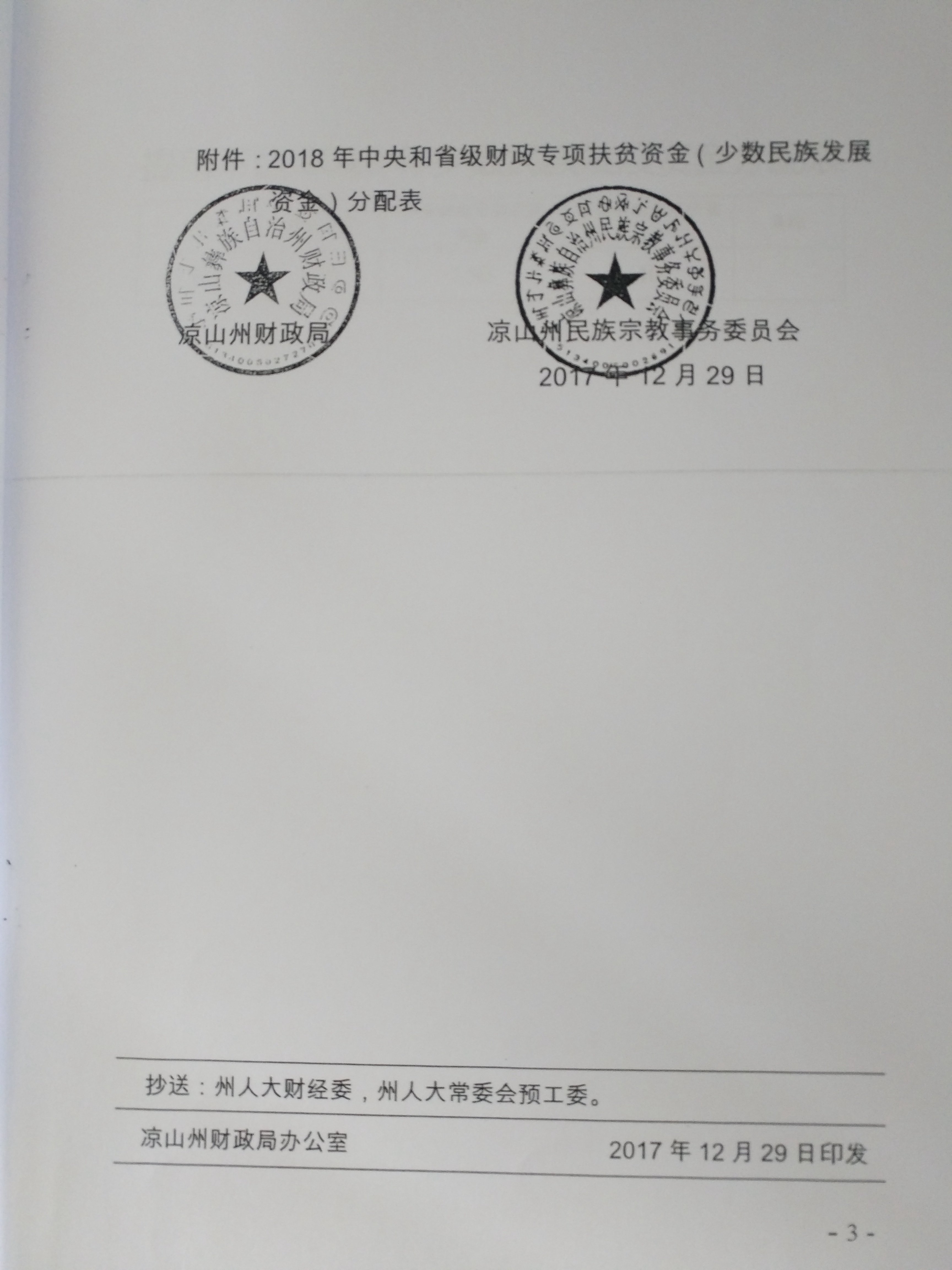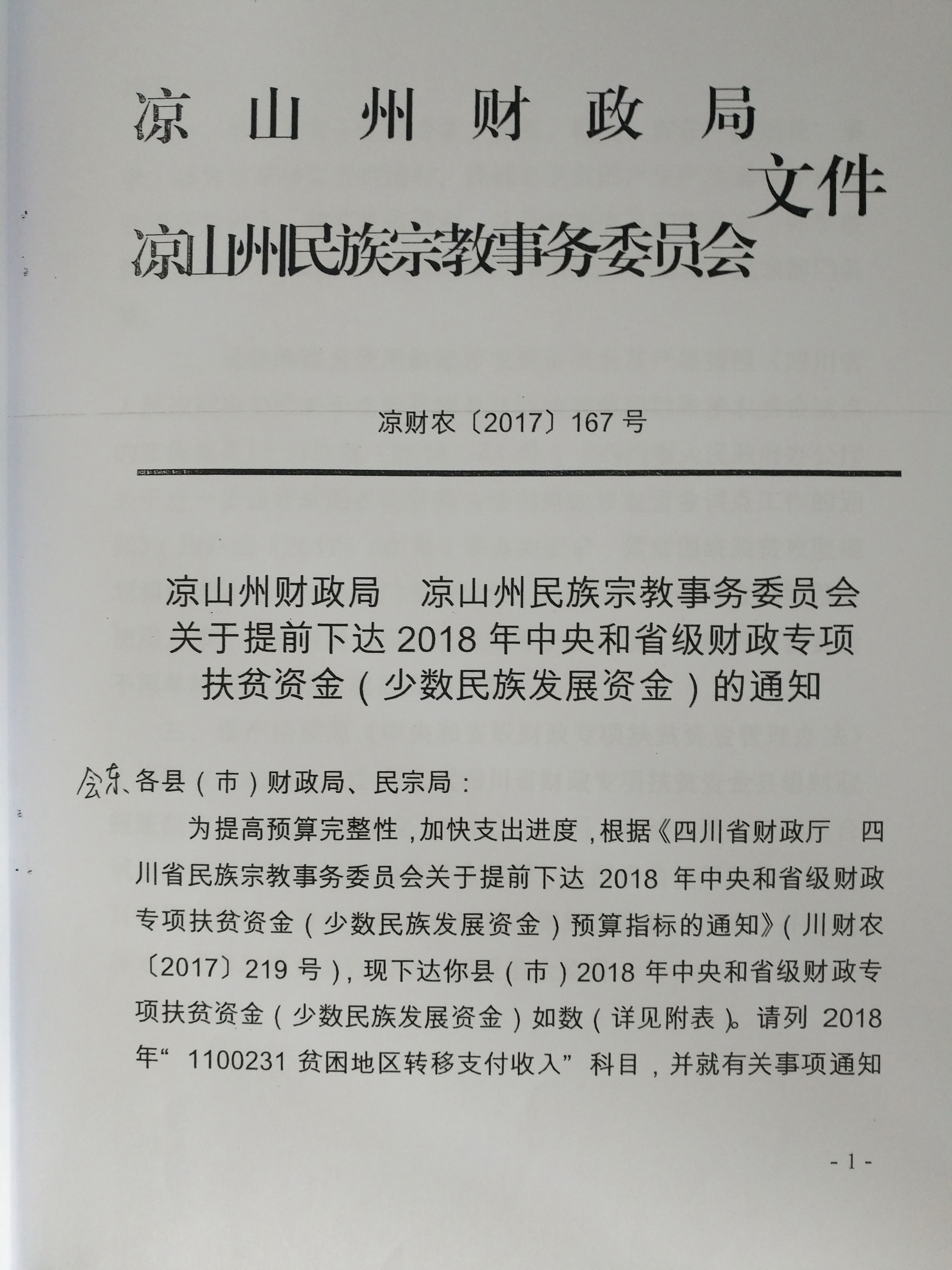 凉山州财政局 凉山州民族宗教事务委员会关于提前下达2018年中央和省级财政专项扶贫资金(少数民族发展资金)的通知