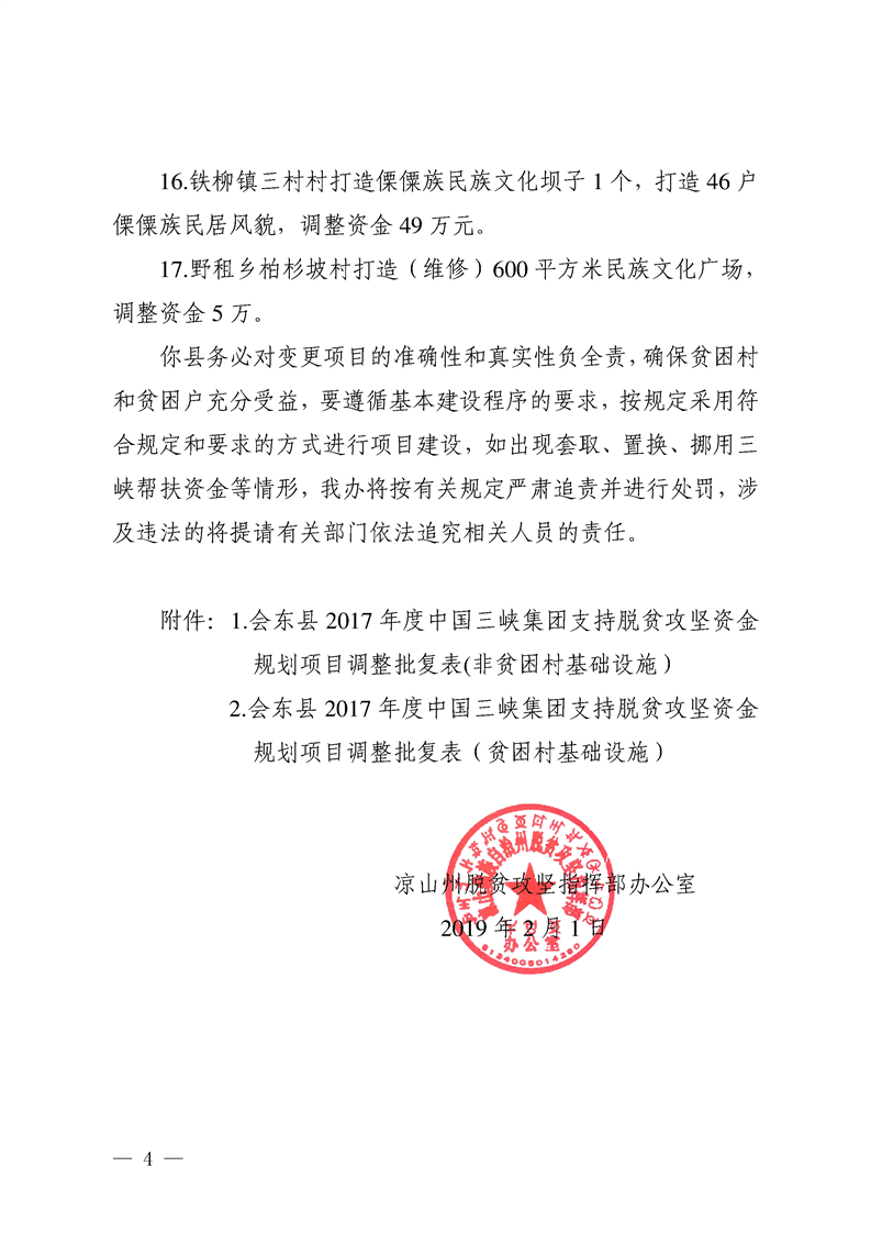 凉山州脱贫攻坚指挥部办公室关于会东县2017年度中国三峡集团帮扶资金项目变更的批复文件