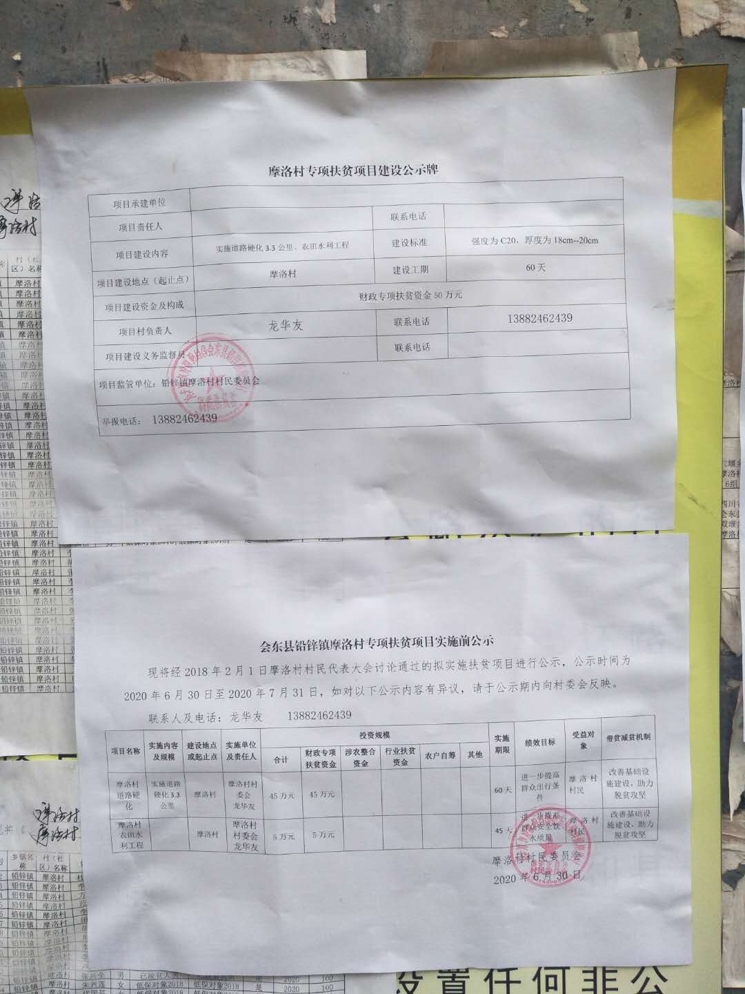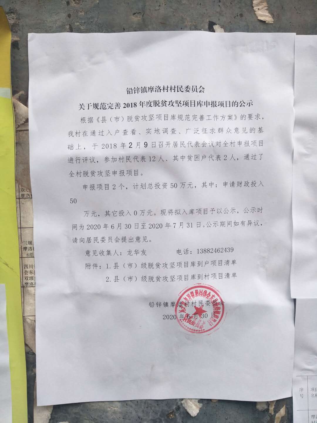 现将经2018年2月1日摩洛村村民代表大会讨论通过的拟实施扶贫项目进行公示,公示时间为2020年6月30日至2020年7月31日,如对以下公示内容有异议,请于公示期内向村委会反映。