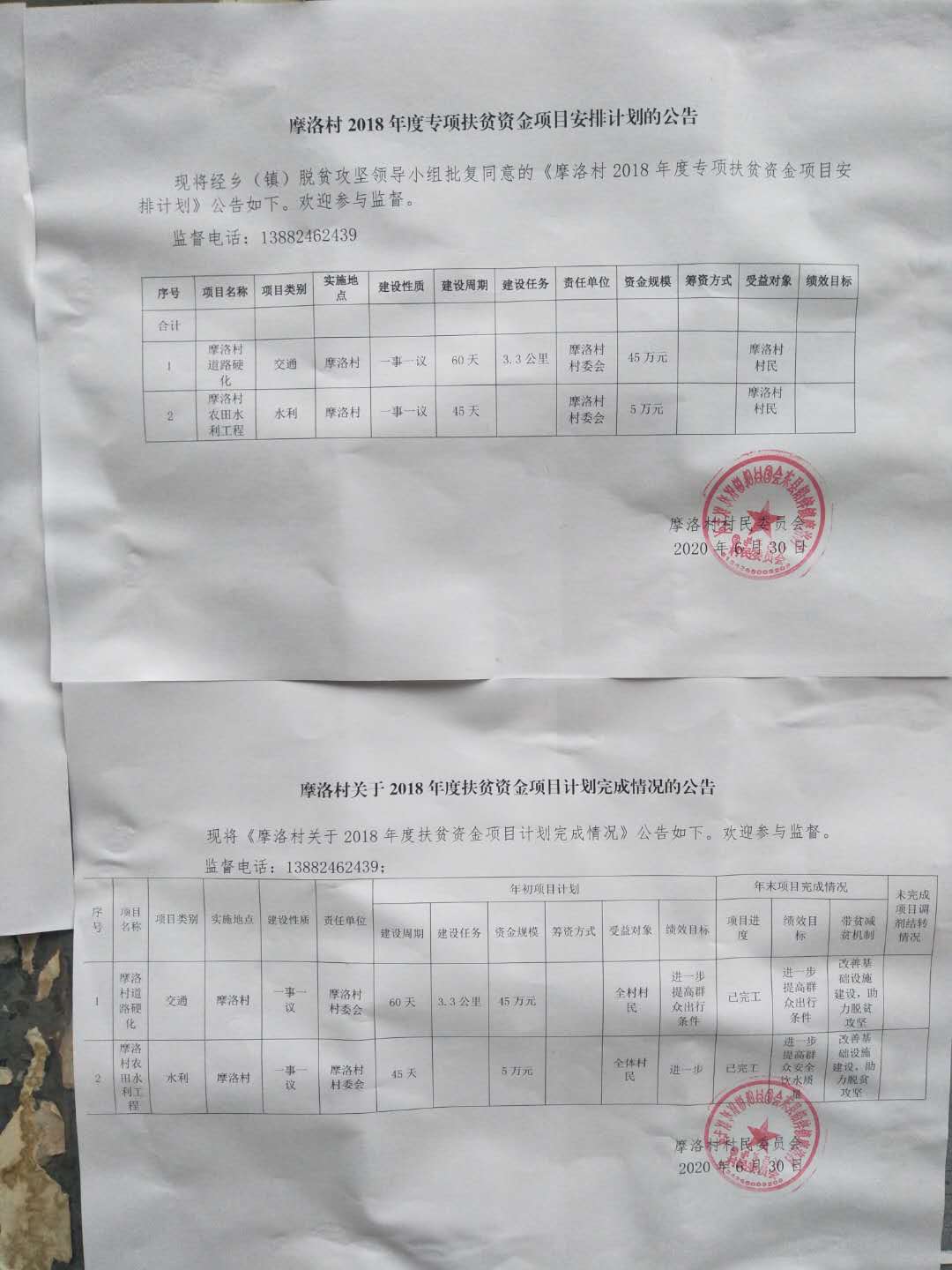 摩洛村关于2018年度扶贫资金项目计划完成情况的公告