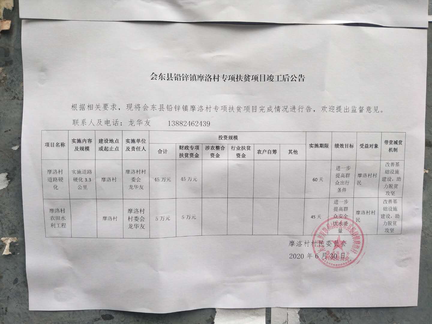 会东县铅锌镇摩洛村专项扶贫项目竣工后公告
