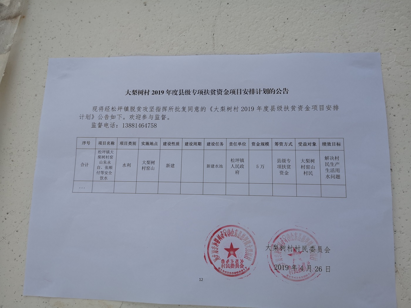 松坪镇大梨树村2019年度县级专项扶贫资金项目安排计划公告