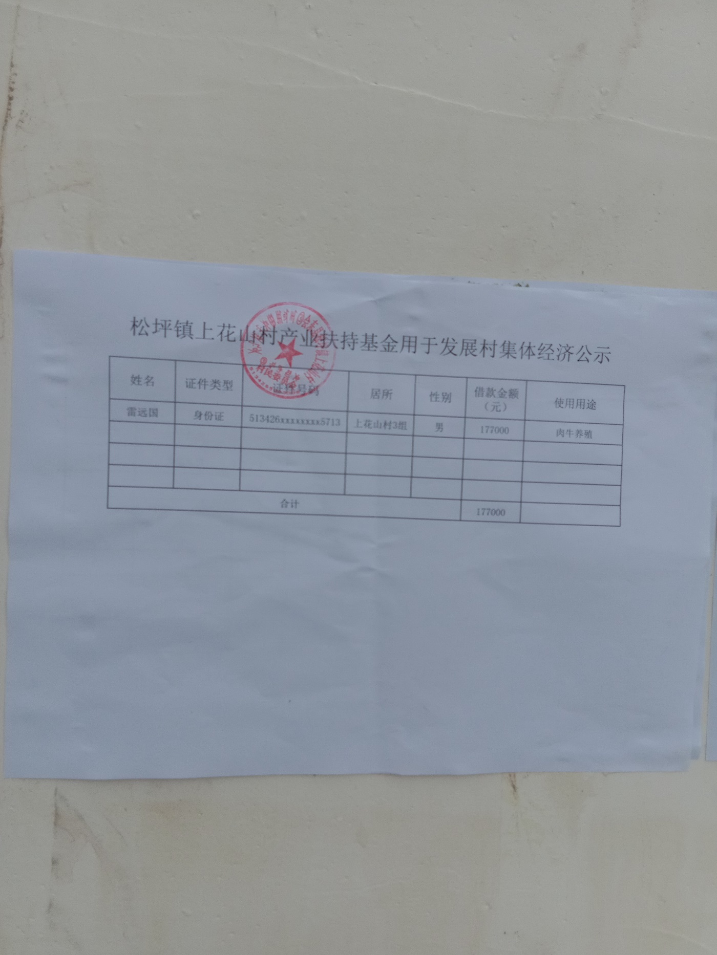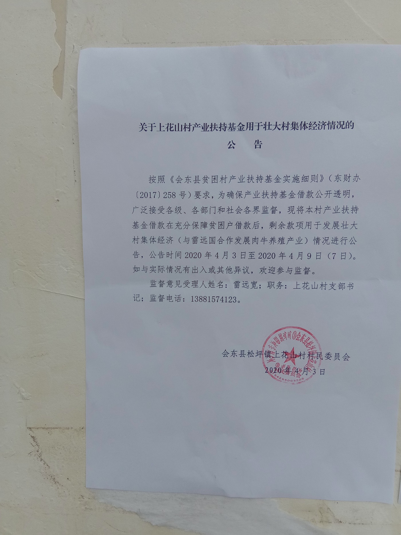上花山村产业扶持基金用于发展村集体经济使用情况公示