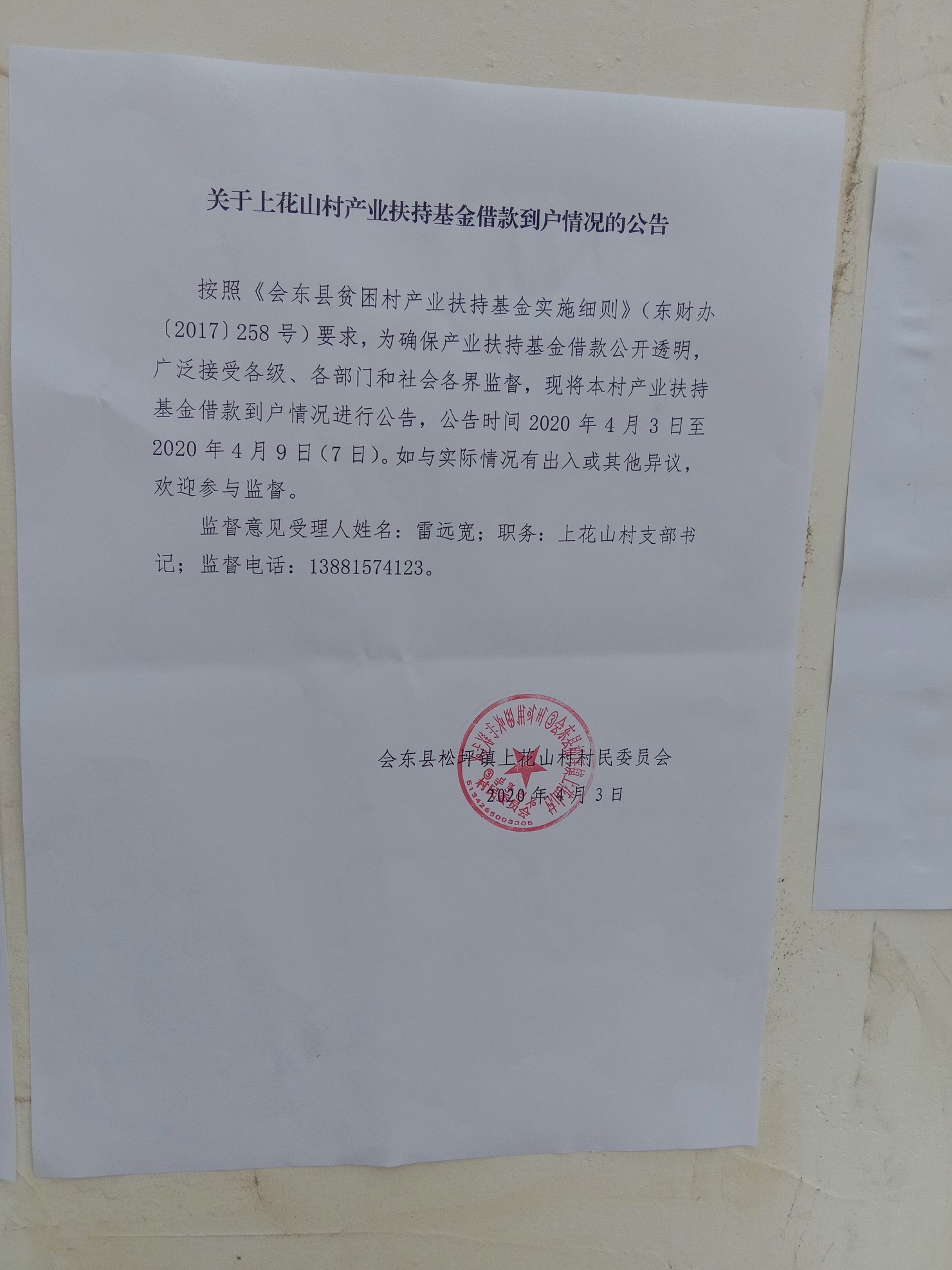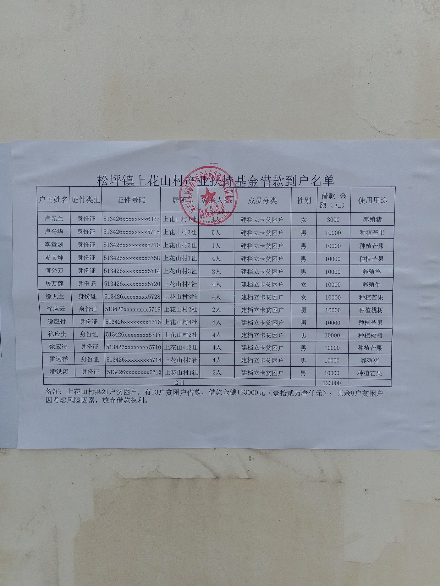 松坪镇上花山村产业扶持基金贫困户借款情况公示