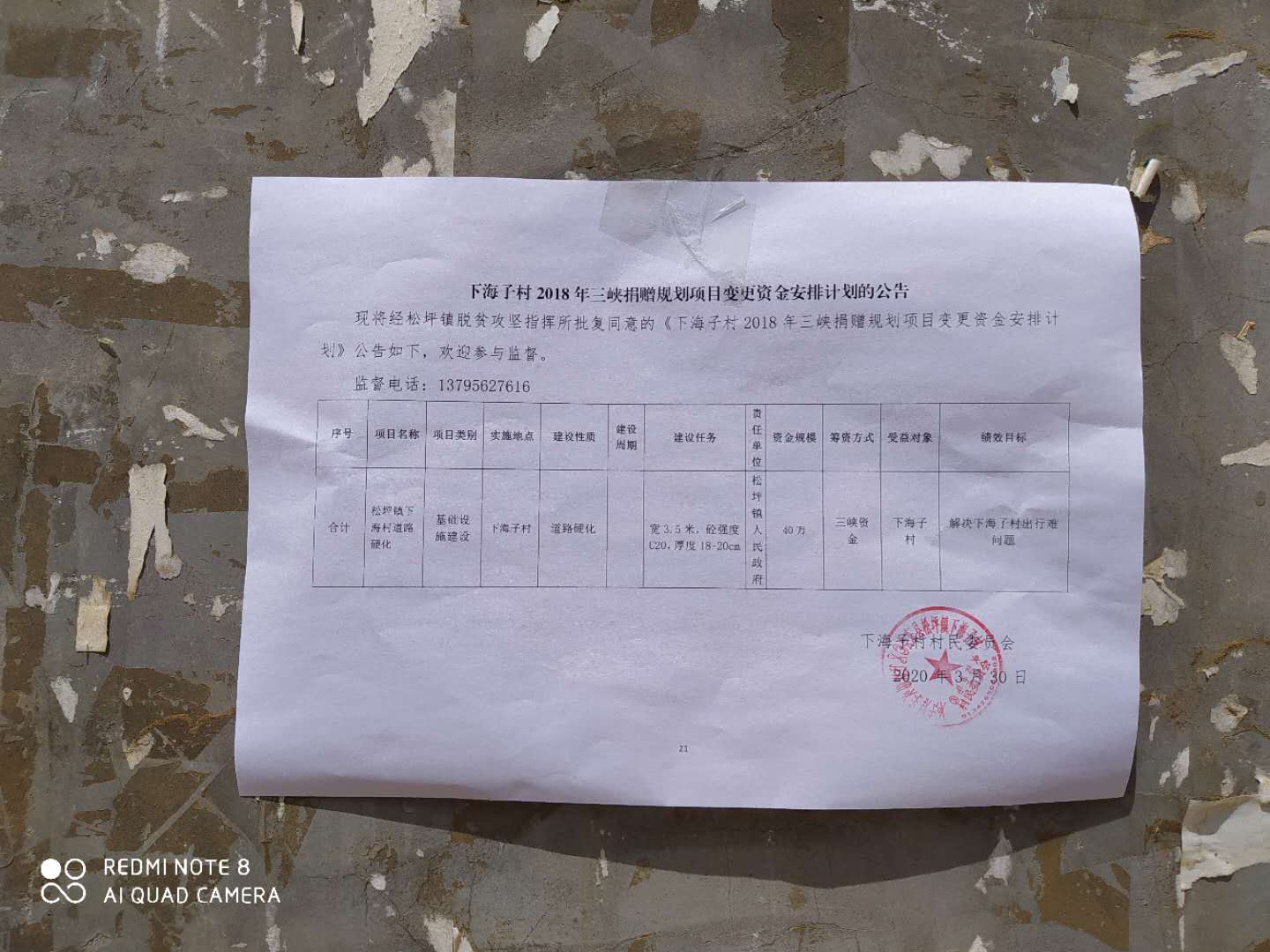 松坪镇下海子村2018年三峡捐赠项目规划变更资金安排计划公告(下海子村道路硬化)