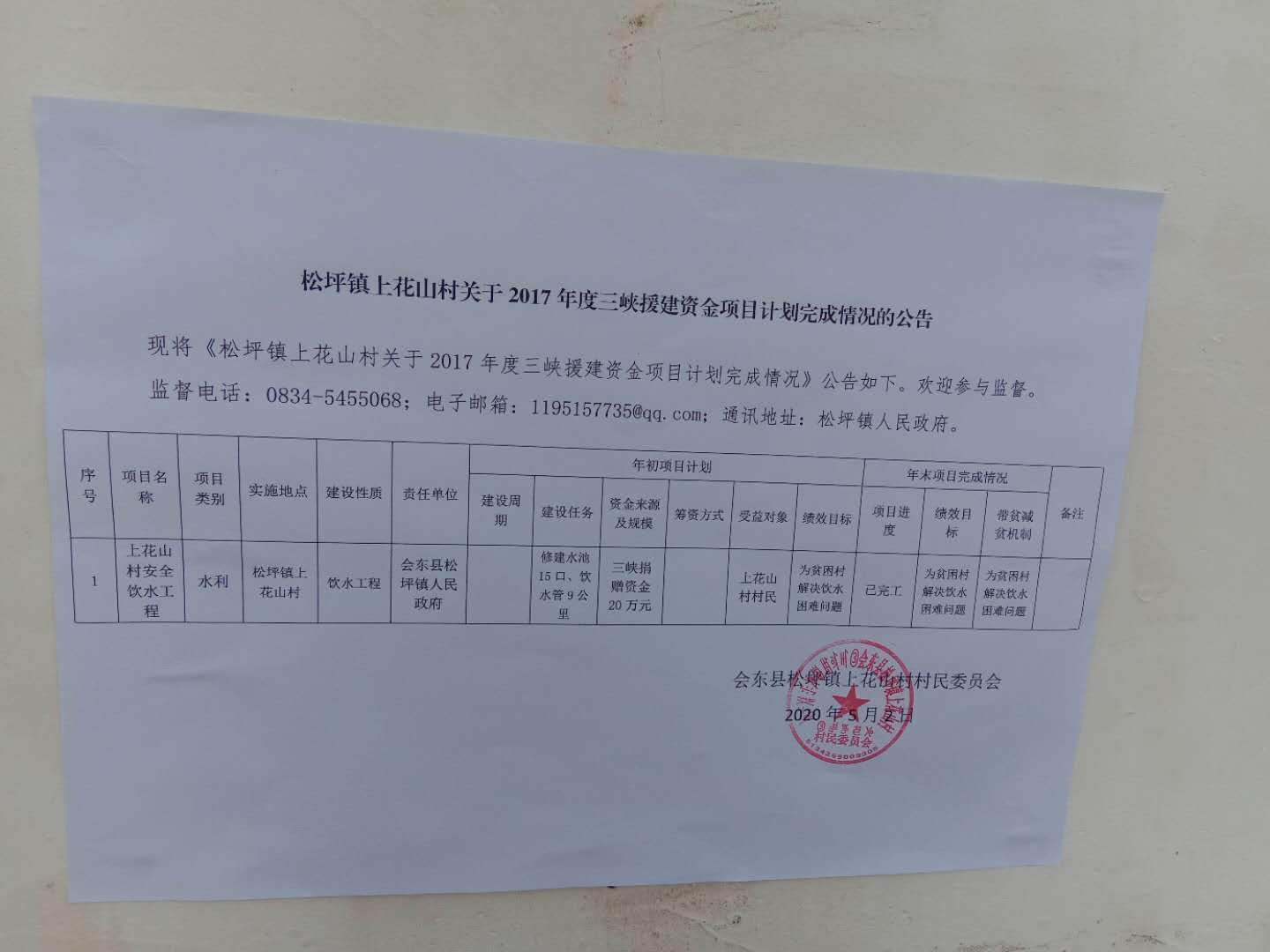 松坪镇上花山村关于2017年度三峡捐赠资金项目完成情况的公告
