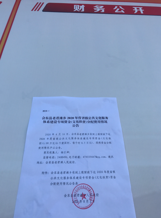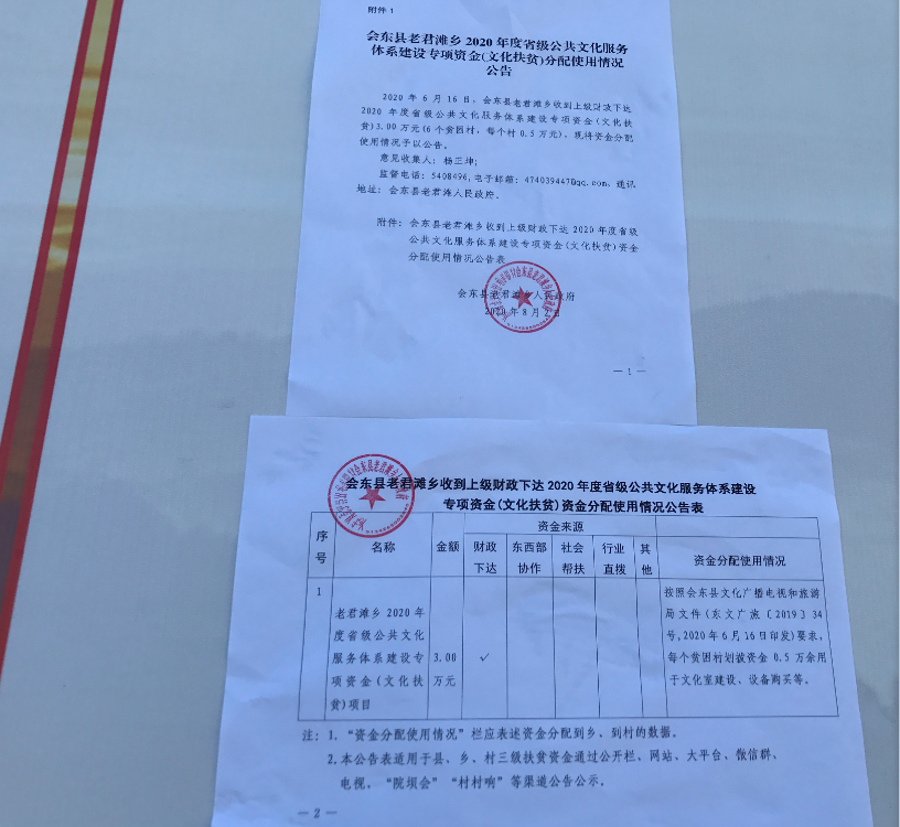 2020年6月16日,会东县老君滩乡收到上级财政下达2020年度省级公共文化服务体系建设专项资金(文化扶贫)3.00万元(6个贫困村,每个村0.5万元),现将资金分配使用情况予以公告。