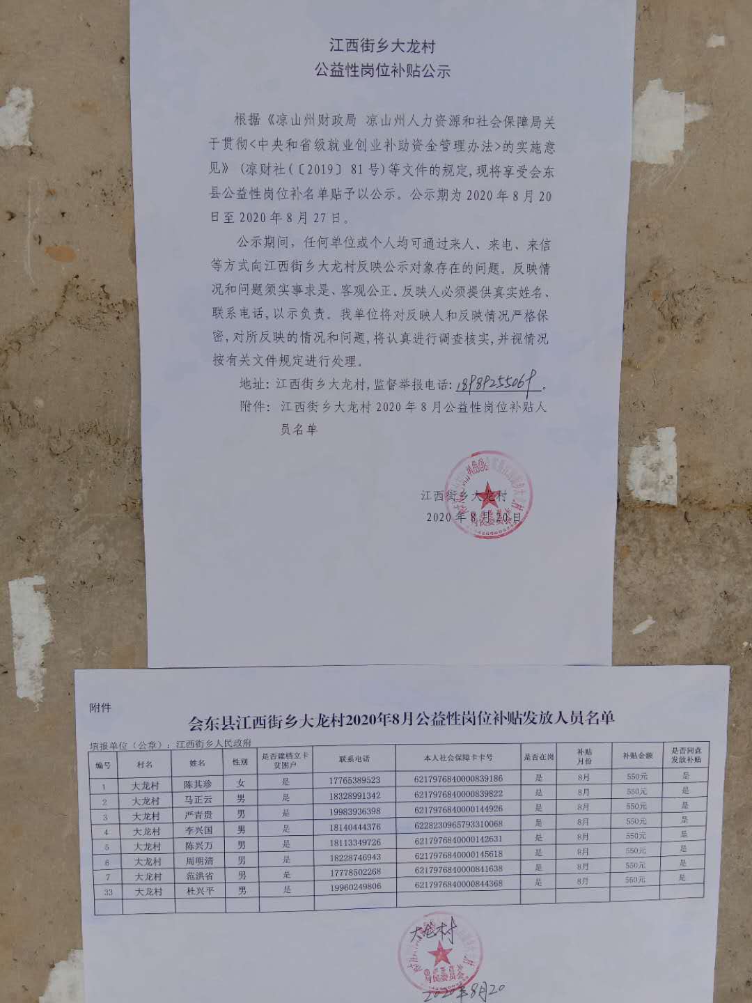 大龙村8月公益性岗位公示