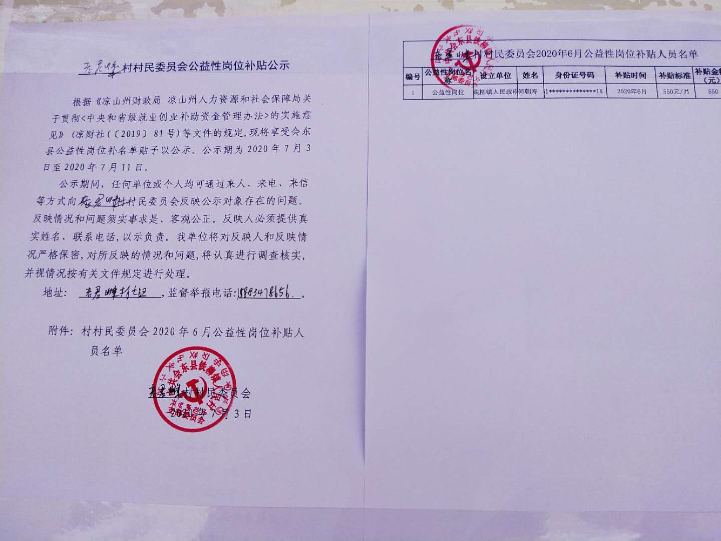 老君峰村(原人民村)2020年6月公益性岗位补贴