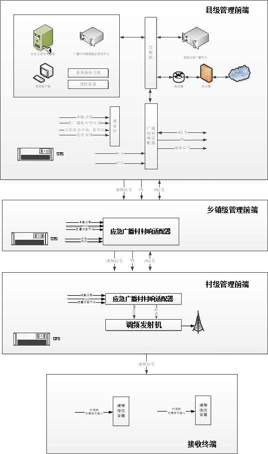 乡级前端由信号接收设备、播放设备、具有应急播发功能的控制设备、话筒等组成,乡级前端可接收中央、省、市广播信号作信源。完成上级信号转播后,可播出本级广播。由于资金原因,本次不建设乡镇级前端。