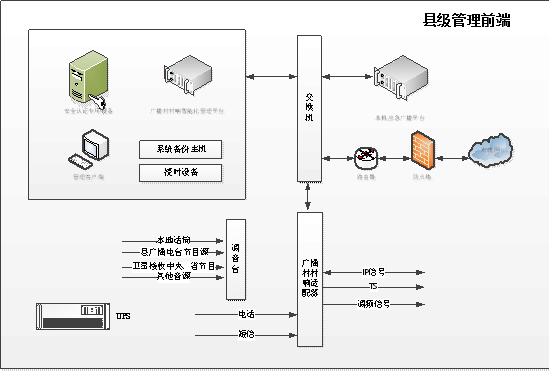 乡镇级管理前端的主要设备包括音源设备(本地话筒、县广播电台节目源、DVD播放器、数字调谐器)、监听音箱、管理客户端、网络交换机、路由器、防火墙等。乡级管理前端系统结构如上图所示。
