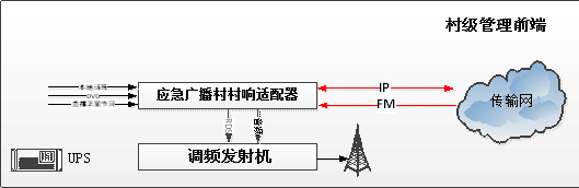 在村级管理前端配置的IP应急广播村村响适配器,接收上级调频信号和IP广播信号并转码适配成音频和RDS信号,输出外接调频发射机(村级发射功率10W),可实现上级信号的的分发传输,实现行政村所辖的自然村组的调频接收音箱接收调频无线信号;在上级传输网络中断或设备故障时,村级平台也能够完成日常广播和应急广播分发传输。