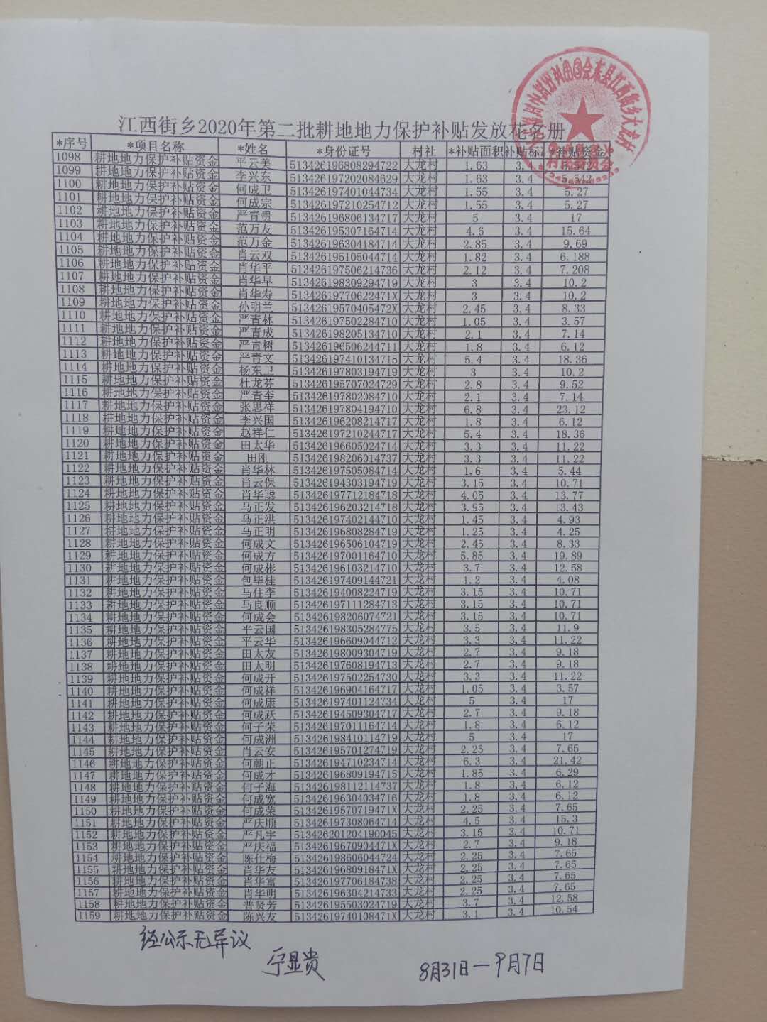 大龙村2020年耕地地力补贴公示图片