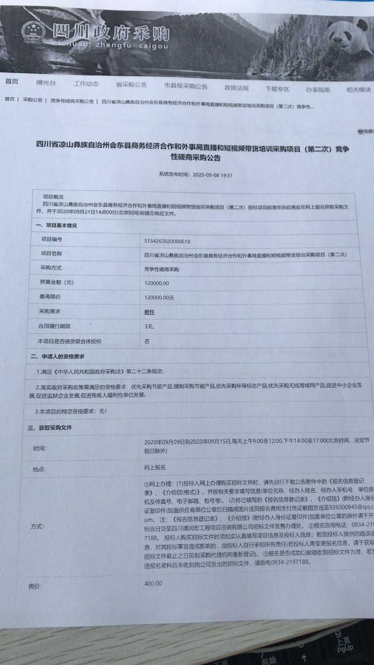 会东县商务经济合作和外事局直播和短视频带货培训采购项目(第二次)竞争性磋商采购公告