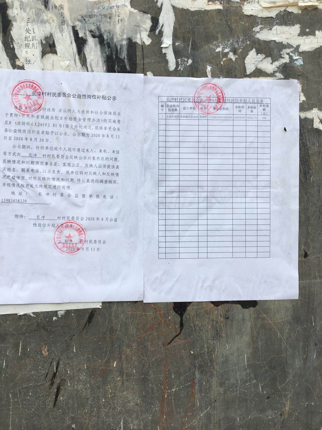长冲村2020年9月公益性岗位补贴公示