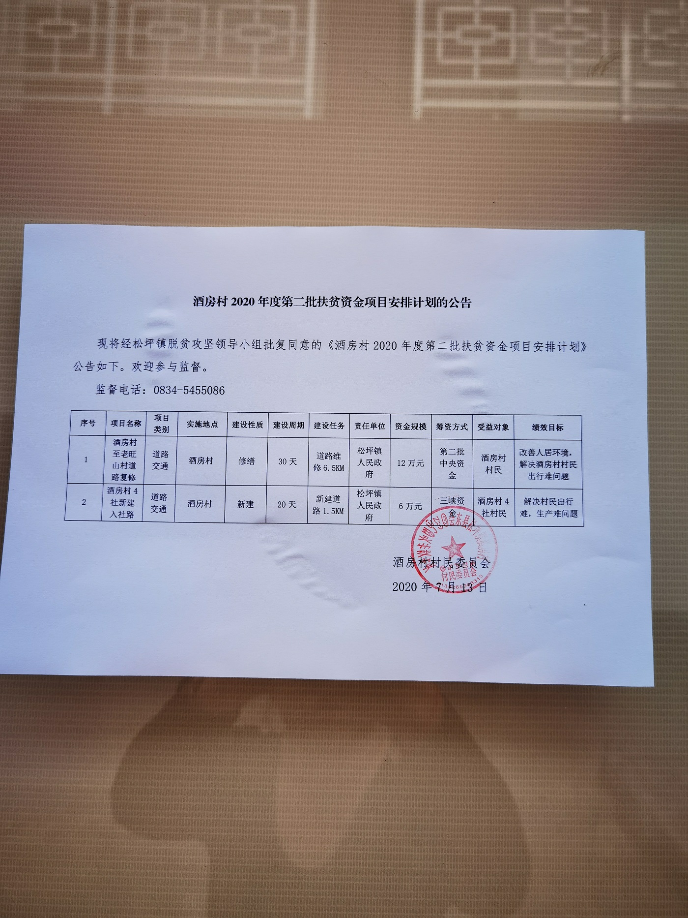 松坪镇酒房村关于2020年度第二批扶贫资金项目安排计划的公告