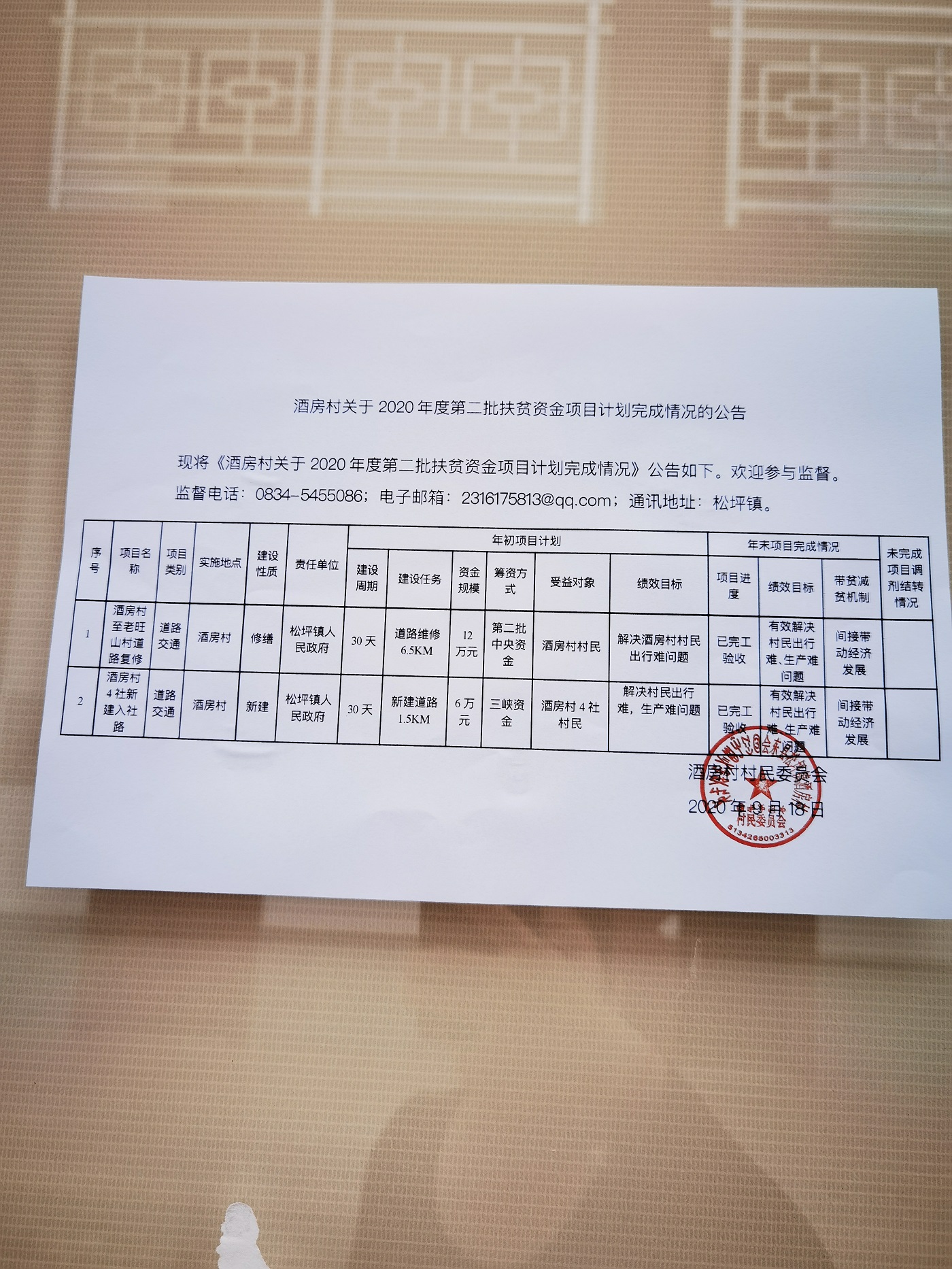 松坪镇酒房村关于2020年度第二批扶贫项目资金计划完成情况的公告