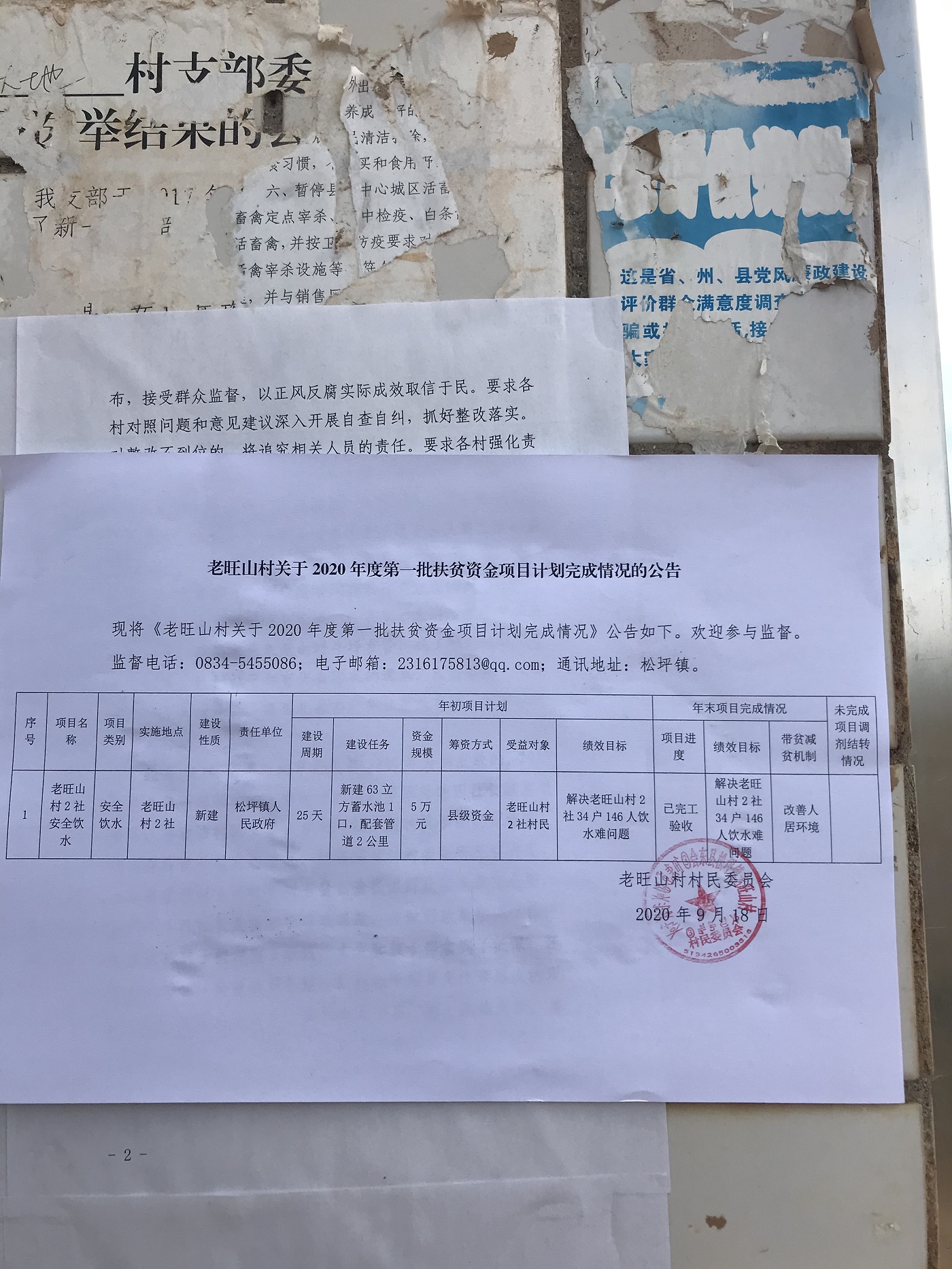 老旺山村关于2020年度第一批扶贫资金项目计划完成情况的公告