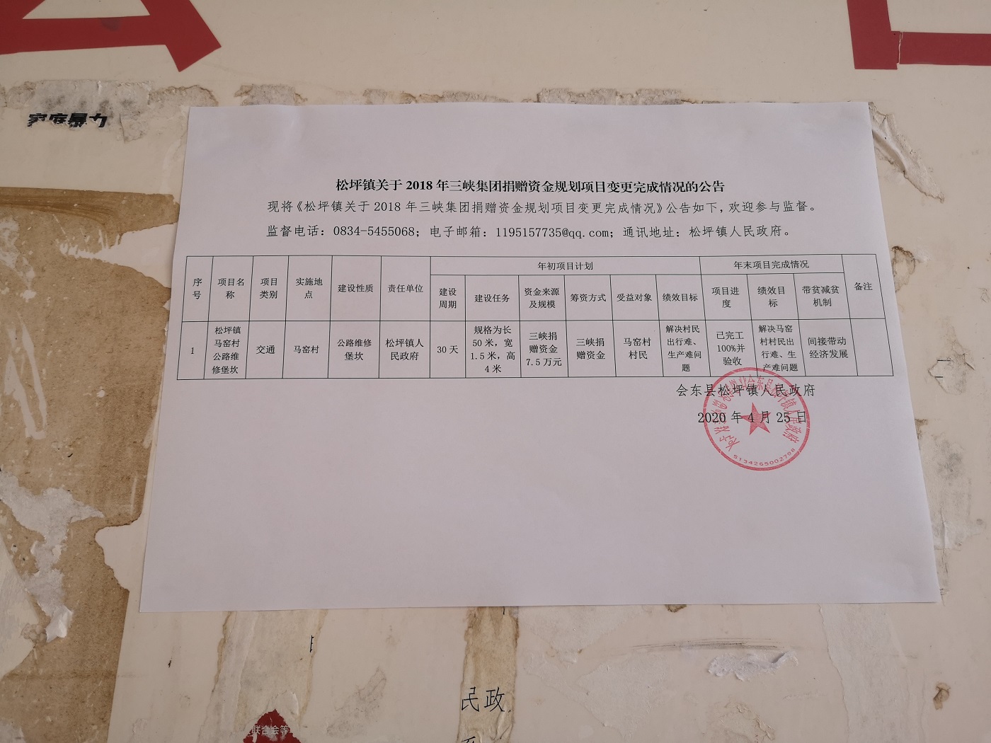 松坪镇关于2018年三峡集团捐赠资金规划项目变更完成情况的公告