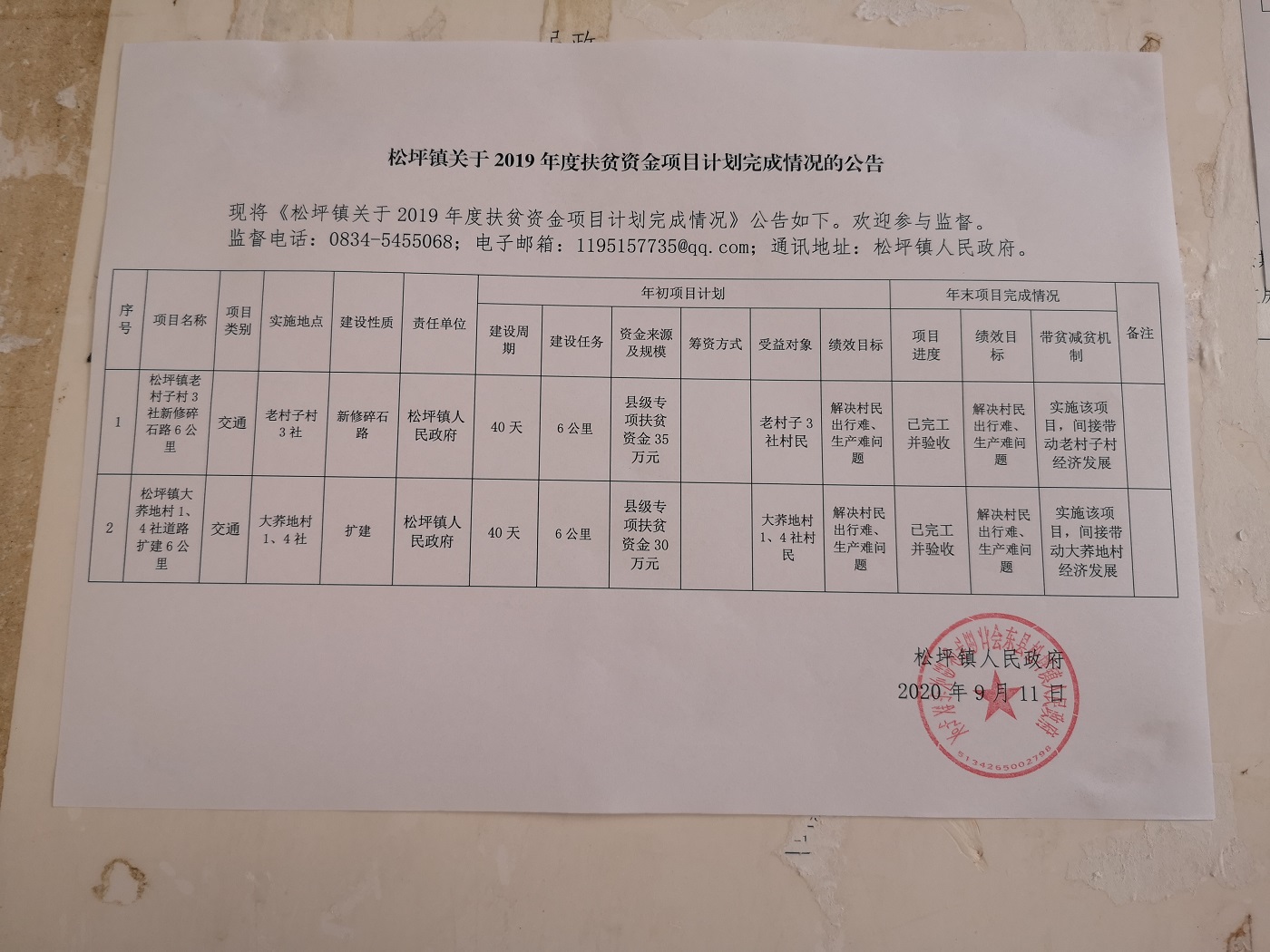 松坪镇关于2019年度扶贫资金项目计划完成情况的公告