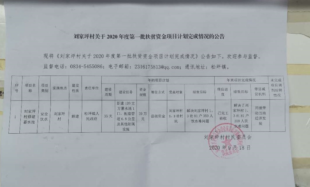 松坪镇刘家坪村关于2020年度第一批扶贫项目资金计划完成情况的公告