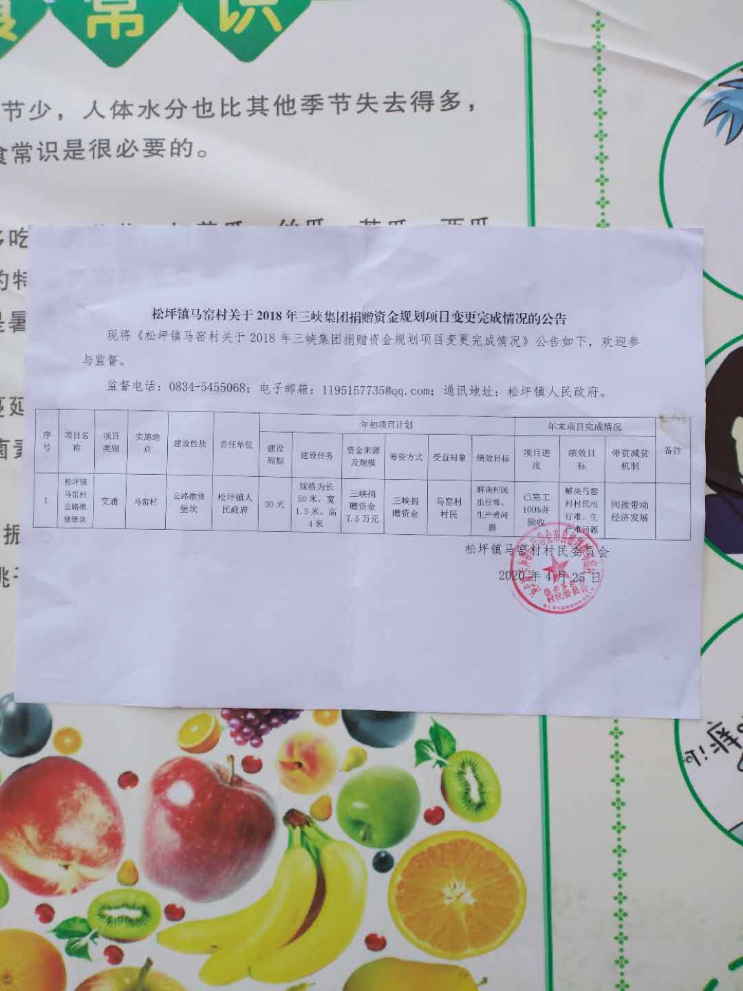 马窑村关于2018年三峡集团捐赠资金规划项目变更完成情况的公告