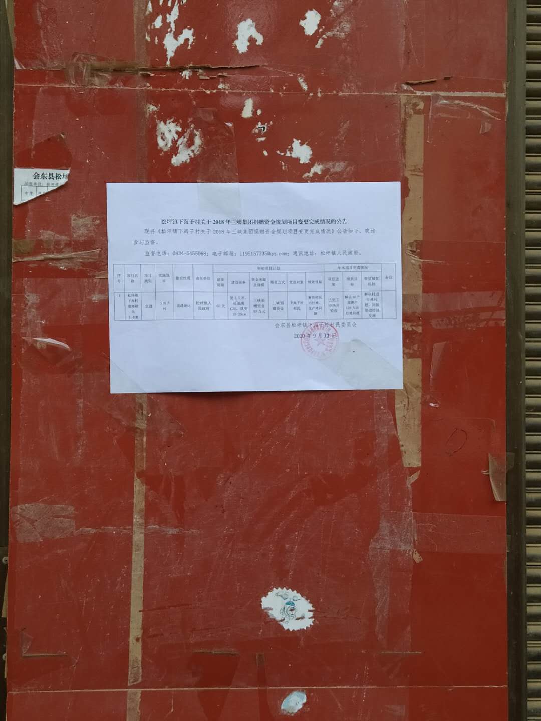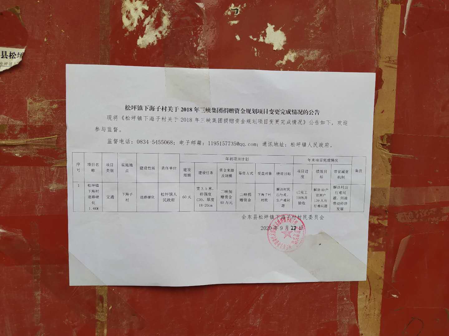 下海子村关于2018年三峡援建资金规划项目变更完成情况的公告
