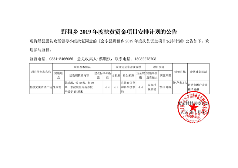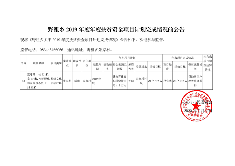 朱家村2019年度资金项目安排计划和项目计划完成情况