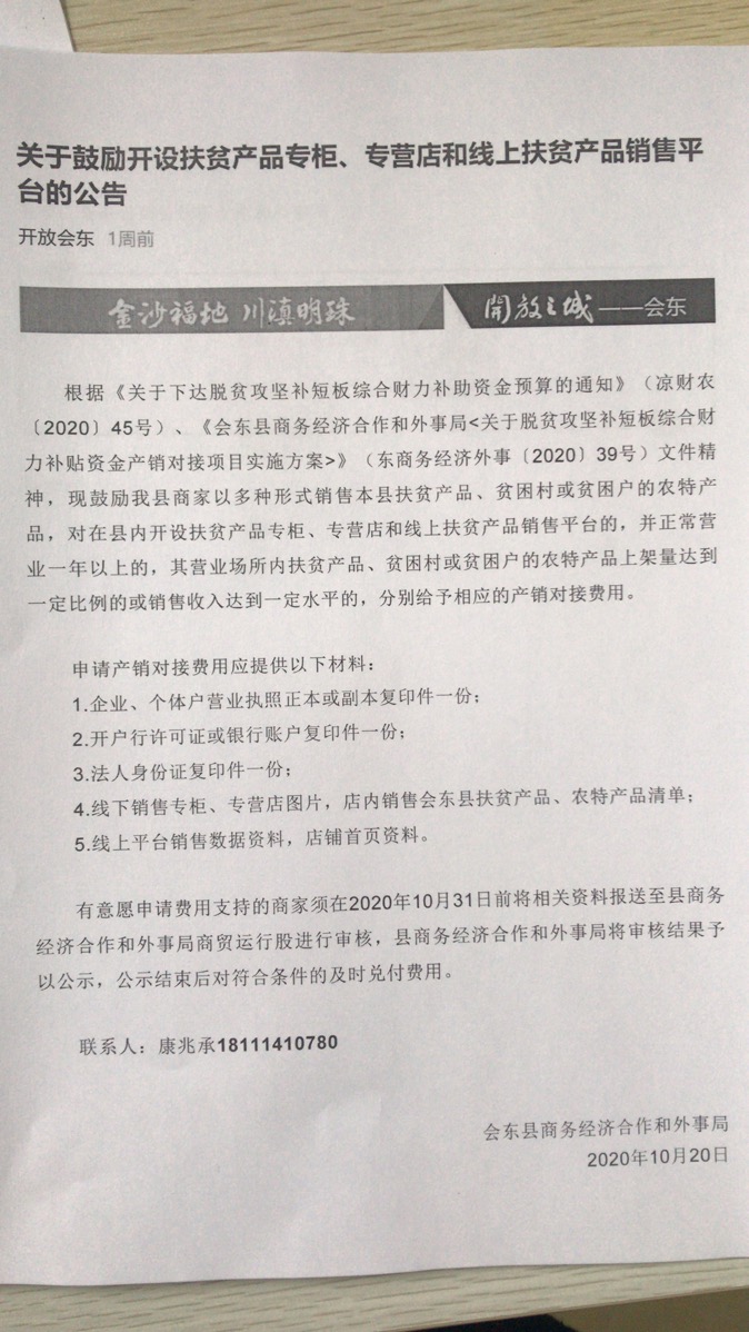 县商务经济合作和外事局 关于鼓励开设扶贫产品专柜、专营店和线上扶贫产品销售平台的公告