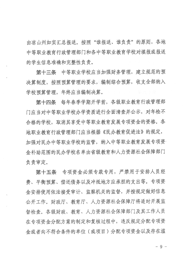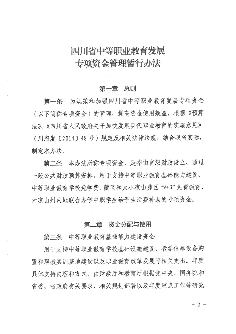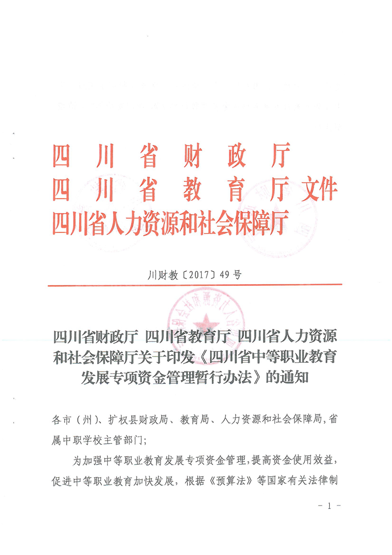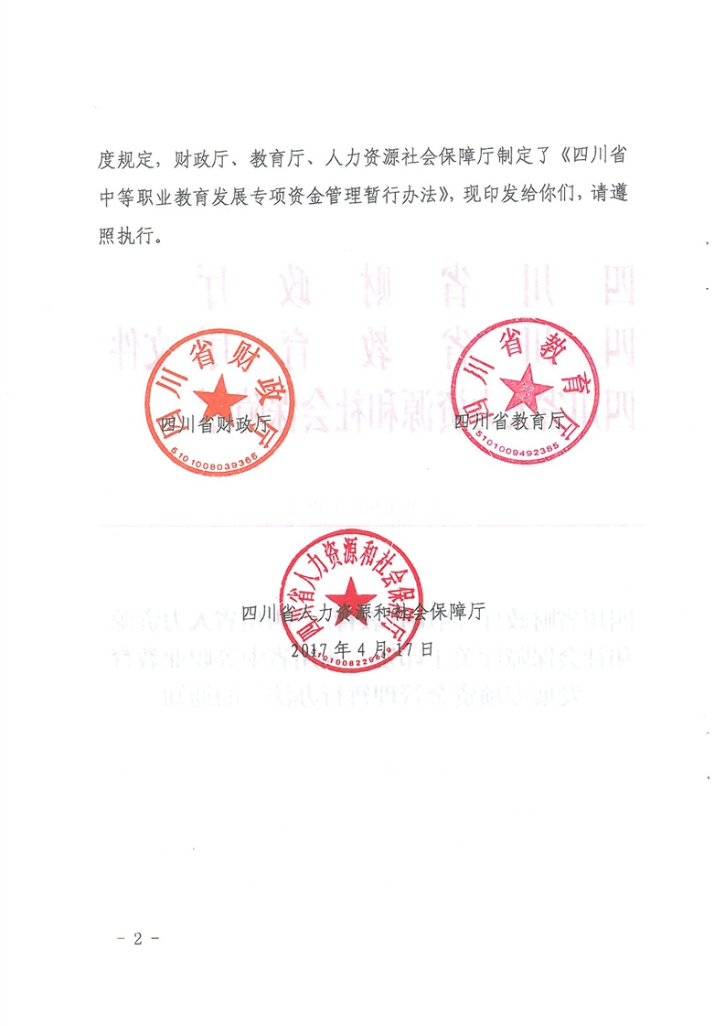四川省财政厅 四川省教育厅 四川省人力资源和社会保障厅关于印发《四川省中等职业教育发展专项资金管理办法》的通知